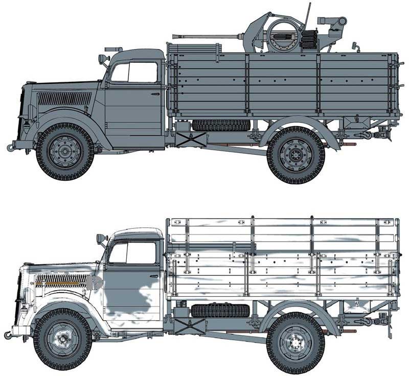 ドイツで生産された後輪2輪駆動の3トントラックはもっとも代表的なトラックのひとつで、生産台数は13万台以上とも言われ、東部戦線をはじめ、ヨーロッパ各戦線や北アフリカでも活躍。また、そのプラットフォームを利用して荷台部分に2cmFlak38を装備し、自走対空砲として使用されたバリエーションタイプも記録されています。