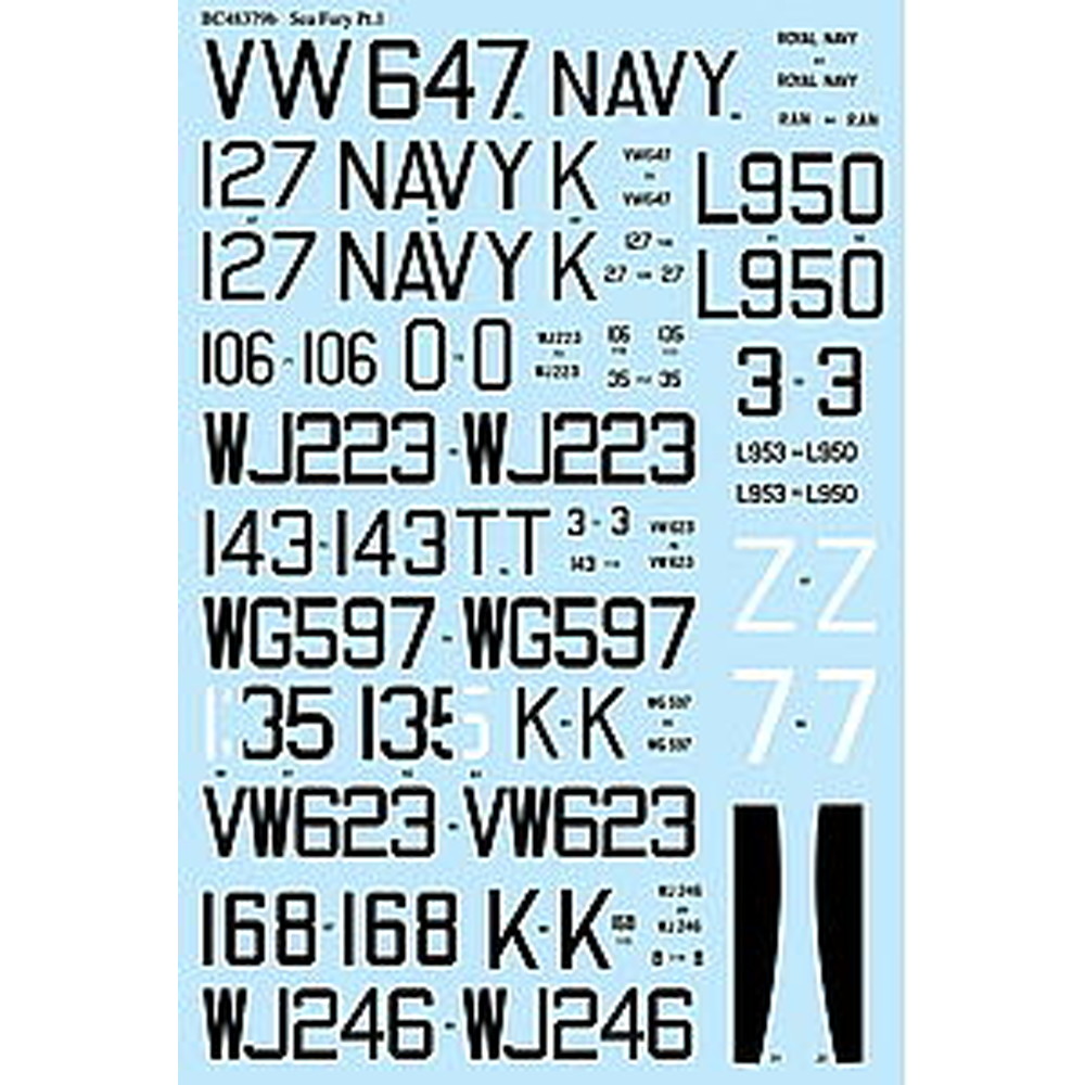 このセットでは第二次大戦後にイギリス海軍が運用した艦上戦闘機、ホーカー・シーフューリーのマーキングを収録しています。シーフューリーを配備運用したイギリス海軍の艦隊航空隊の機体やオーストラリア、さらに、パキスタンの各国で運用された機体の中から計7機のマーキングをセレクト。