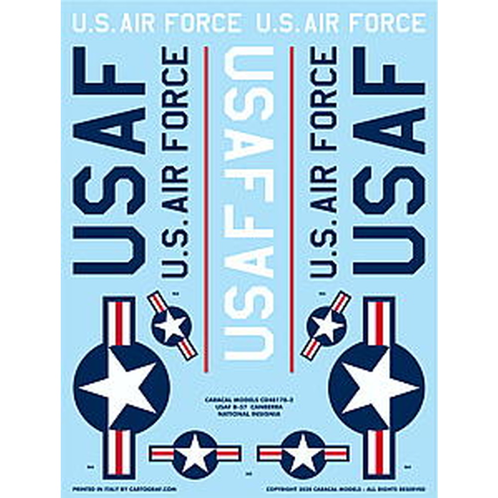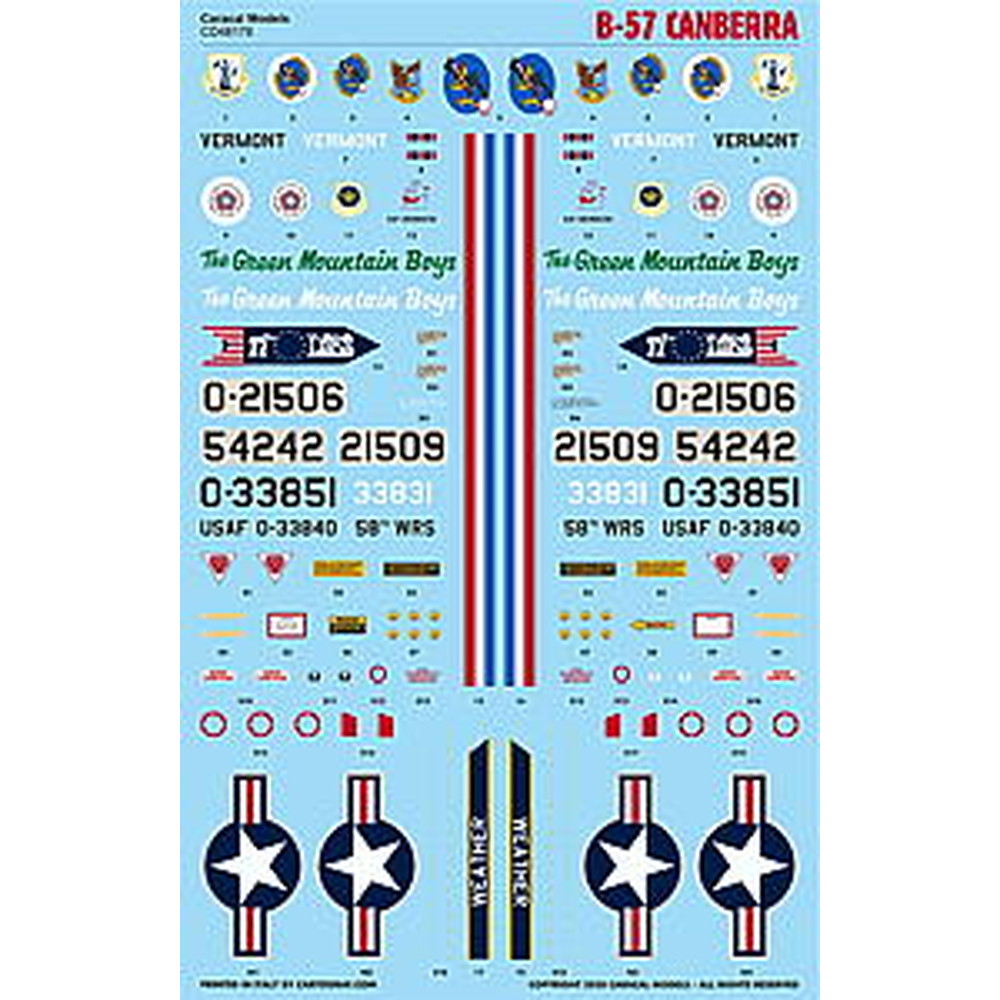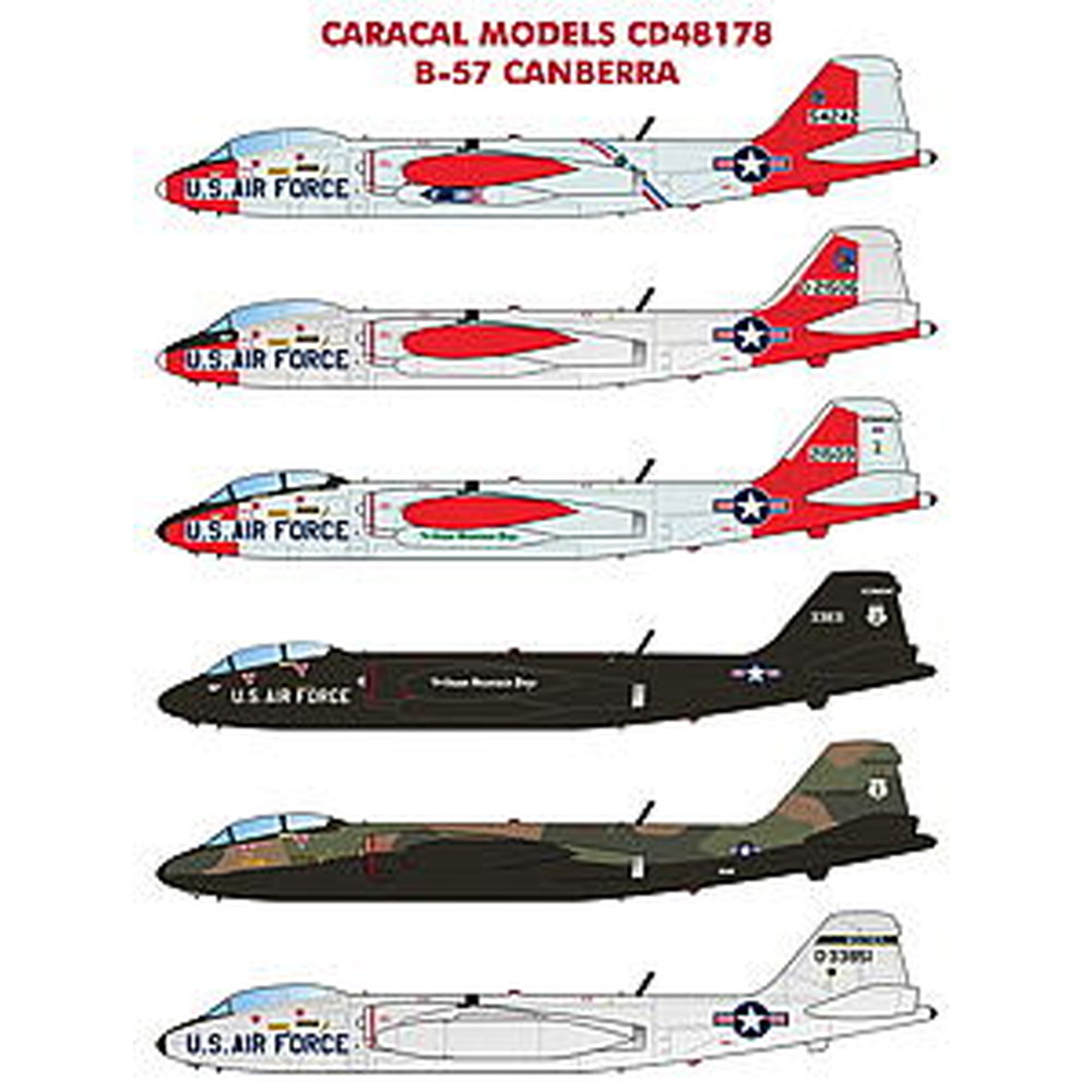 このセットはイギリス空軍の軽爆撃機として開発され、のちにアメリカ空軍でも運用されるようになった双発のジェット爆撃機B-57キャンベラのマーキングを収録したデカールのセットです。