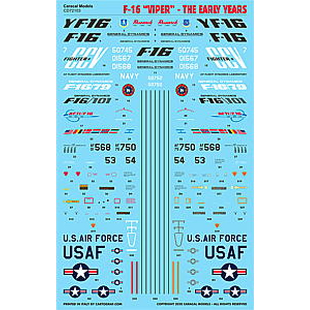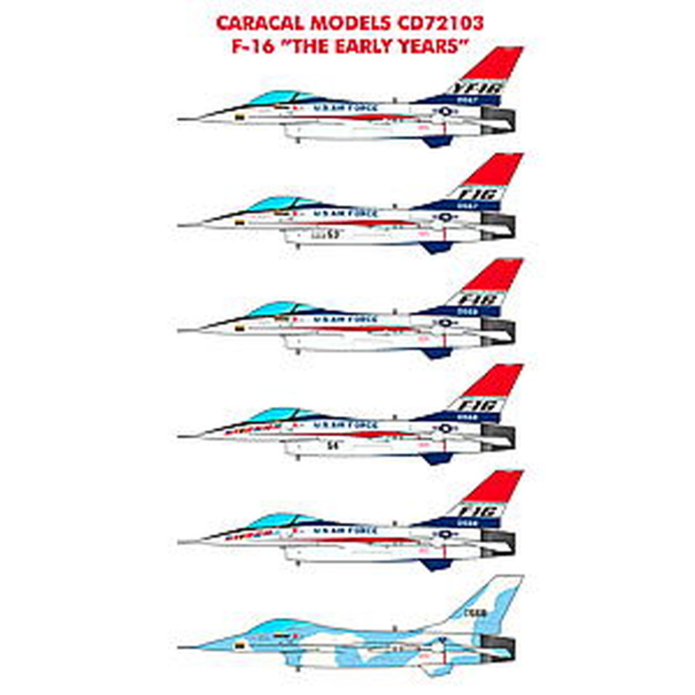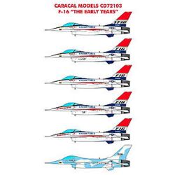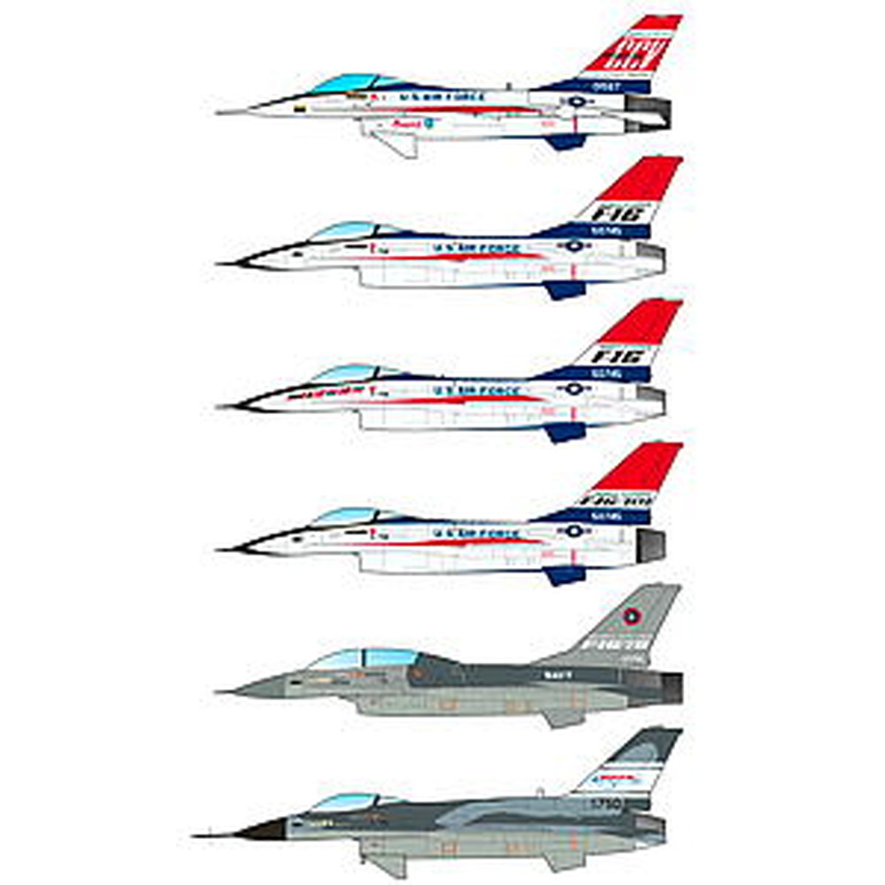 このセットはアメリカで開発された戦闘機F-16の開発時など、プロトタイプを含む初期タイプの機体のマーキングも含めて、11種類のマーキングを収録。