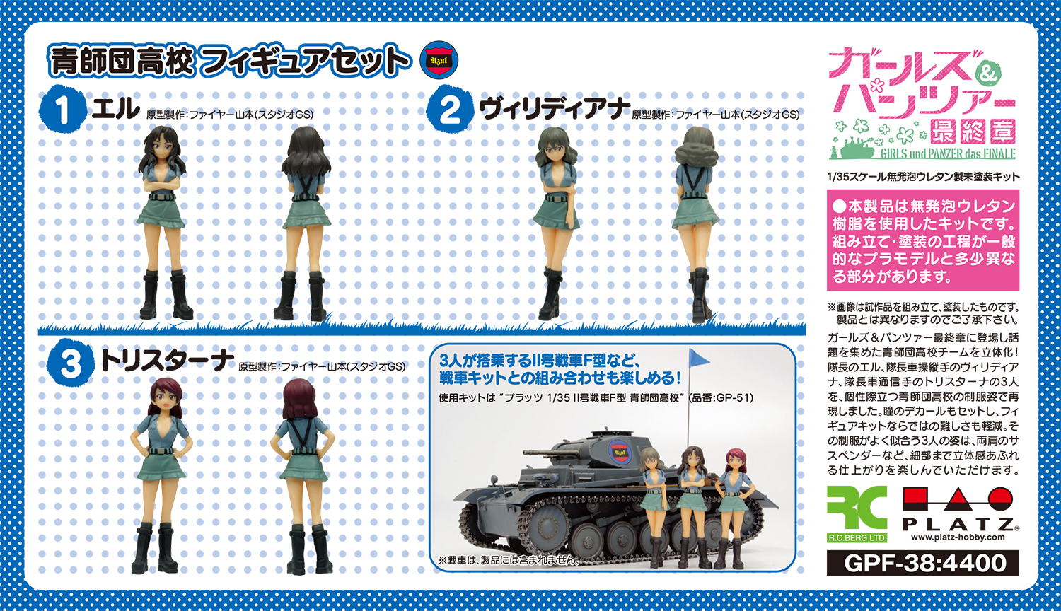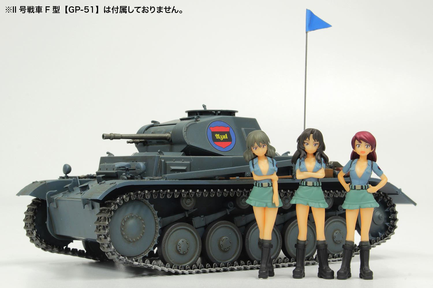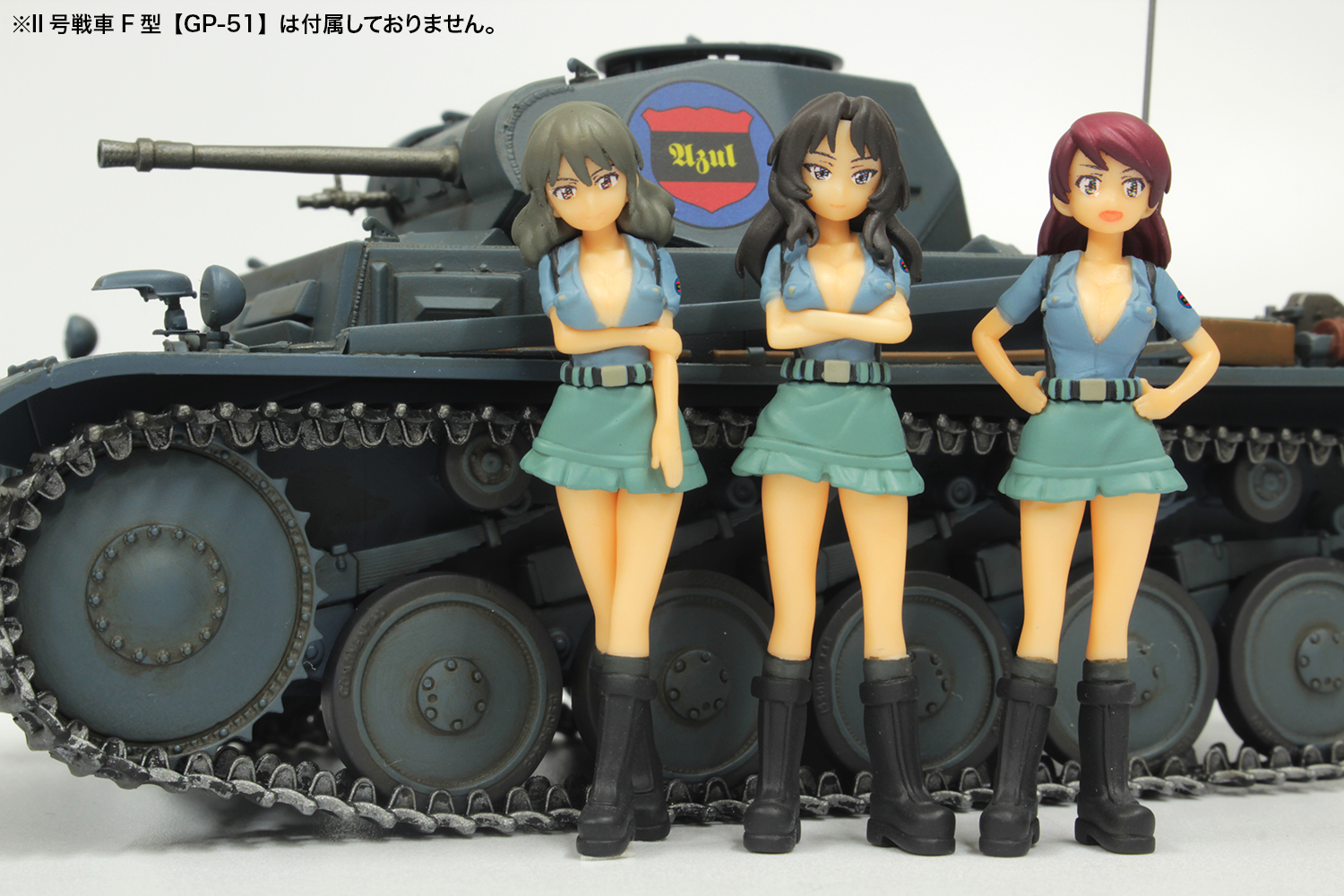 最終章の劇中では「無限軌道杯」の1回戦でサンダース大学付属高校と対戦した青師団高校。エル隊長と、隊長車(ll号戦車F型)に搭乗する二人、操縦手のヴィリディアナ、通信手のトリスターナをフィギュア化しました。専用の瞳デカールも付属します。