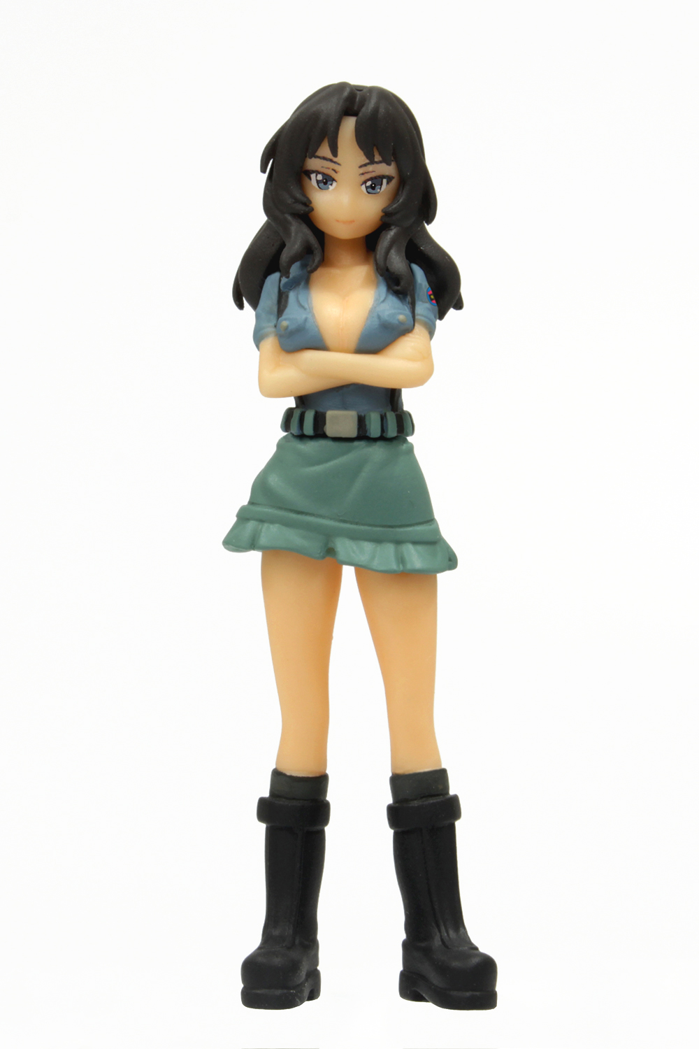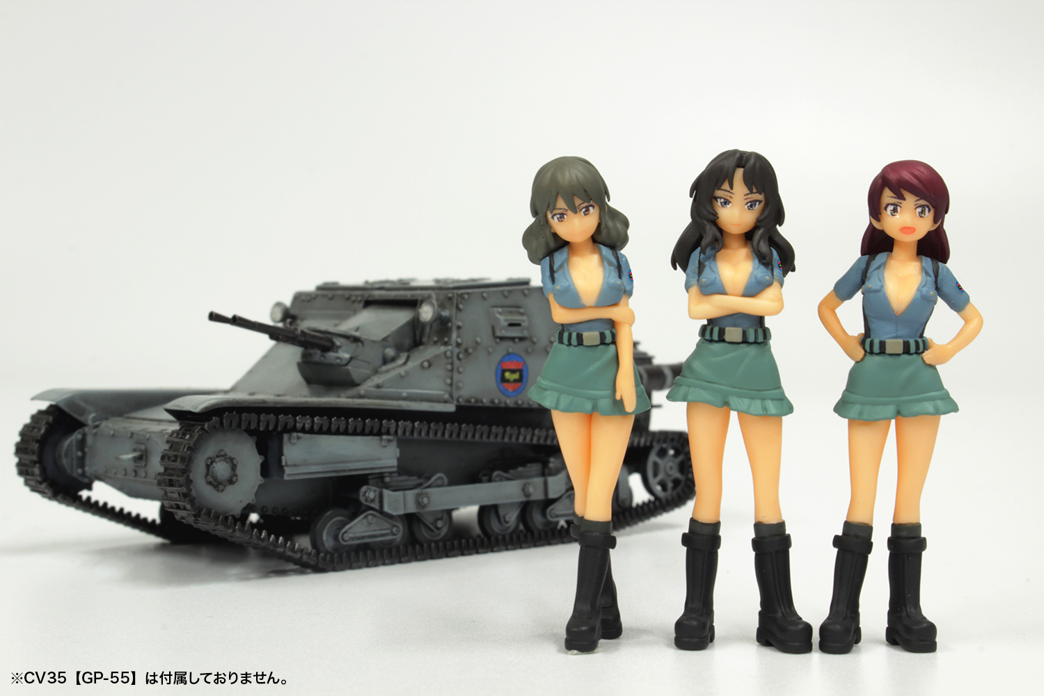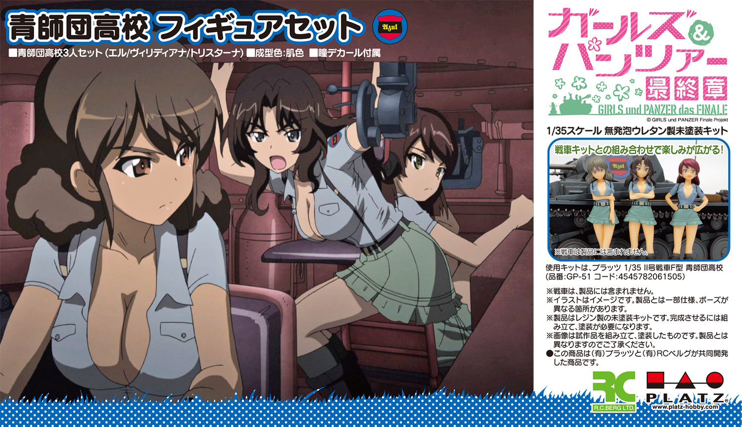 最終章の劇中では「無限軌道杯」の1回戦でサンダース大学付属高校と対戦した青師団高校。エル隊長と、隊長車(ll号戦車F型)に搭乗する二人、操縦手のヴィリディアナ、通信手のトリスターナをフィギュア化しました。専用の瞳デカールも付属します。