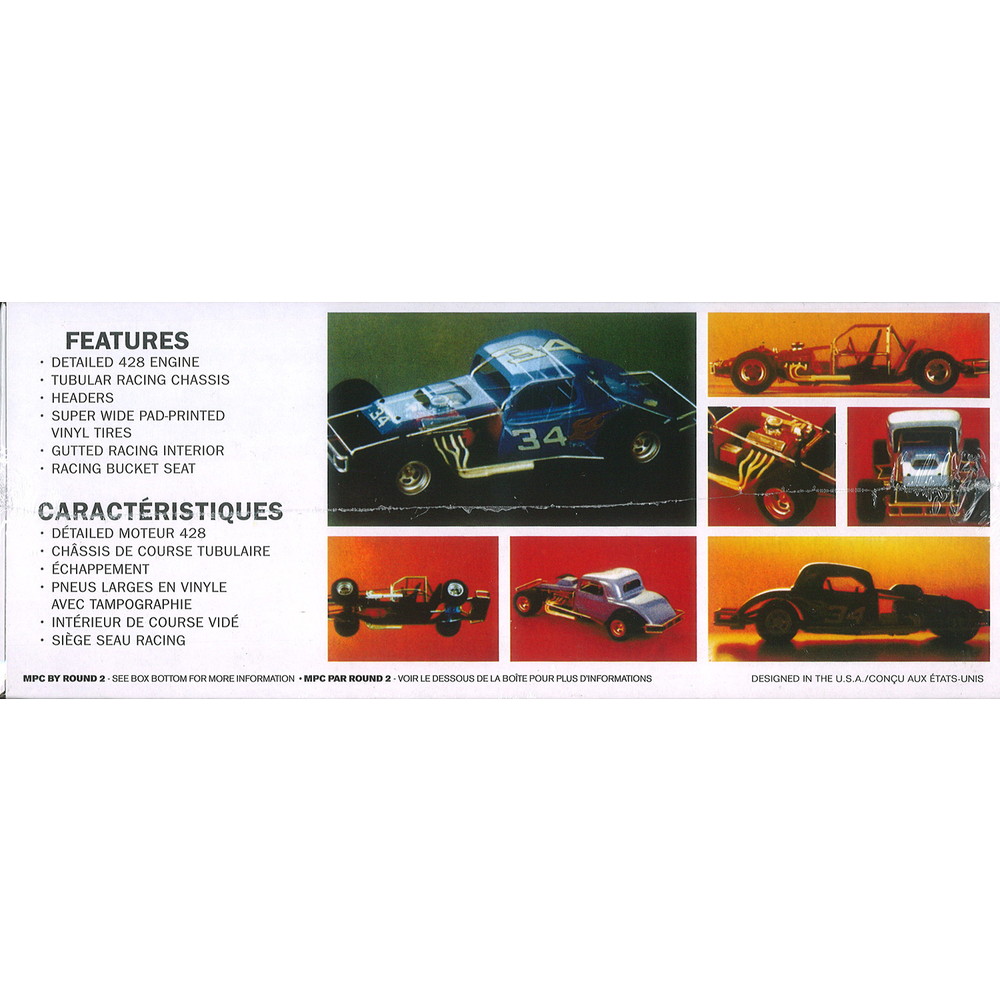 メインのシャシーフレームはチューブラースペースフレームのシャシーを正確に再現。ロールケージの中にはドライバーのシートやステアリングなどをモデル化。フロントにはV型8気筒の428エンジンをセット。たこ足の形状を再現したエキゾーストパイプなどがパワーを感じさせる仕上がりです。さらに、前後サスペンション、ドライブトレインなどのメカもリアルな仕上がりが楽しめます。そして、ボディには1934年型のクラシカルなクーペスタイルの車体をウインドウから後部のみ再現。シャシーに被せる形が競技専用車ならではの迫力を味わえる仕上がりです。タイヤはサイドウォールにロゴをプリント済みのビニールタイヤを用意。ダートレースならではの汚し塗装など、施してみるのも楽しいでしょう。
