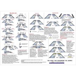 このセットではギリシャで運用されているF-16Cのマーキ ングを収録しています。ギリシャ空軍の機体に対応し、セット はスコードロンテールマークと基本的なラウンデルさらに、機 体番号のマーキングが収録されたセットです。