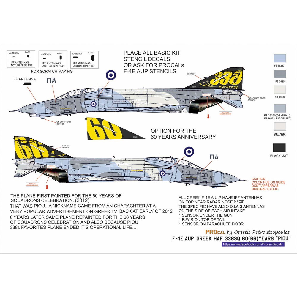 このセットでは、F-4Eファントムのマーキングを収録しています。 ギリシャ空軍の第338攻撃飛行隊が2012年にその誕生60周年を 記念して施していたマーキングを再現。また、その6年後にF-4 ファントムがその運用の終了を終えるのに合わせて同じ機体に66 周年の飛行隊の記念マーキングが描かれていました。338飛行隊 を表す「338」の数字、60周年の「60」と66周年の「66」を表す イエローの文字が目を引くマーキングです。