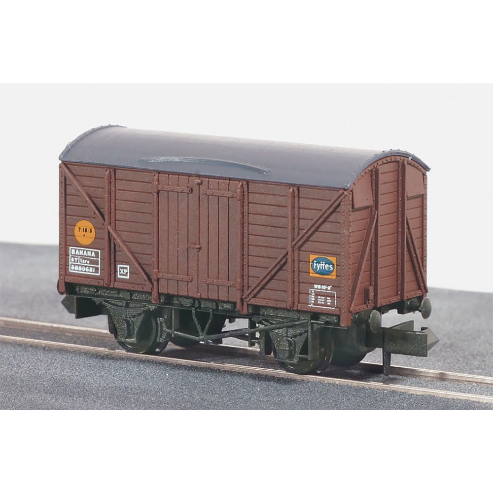屋根付きの貨車で戦後に主に運用されたのが合板を車体に使用した木造有蓋車(ボックス バン)です。中でもバナナの輸送に使用されたものはその名の通りにバナナ貨車(バナナバ ン)などと呼ばれました。港に到着したバナナを国内各地に流通させるためにイギリスで 1960 年代など、多く使用されました。イギリスの鉄道が国有化され、統合される以前は 個人の企業がそれぞれに資材や商品の輸送用に鉄道の貨車を保有していました。1888 年 に設立され、バナナを中心に各種果物の輸入販売を行っていたファイフスもその一つで、 バナナの輸送に専用の貨車を運用していたのです。