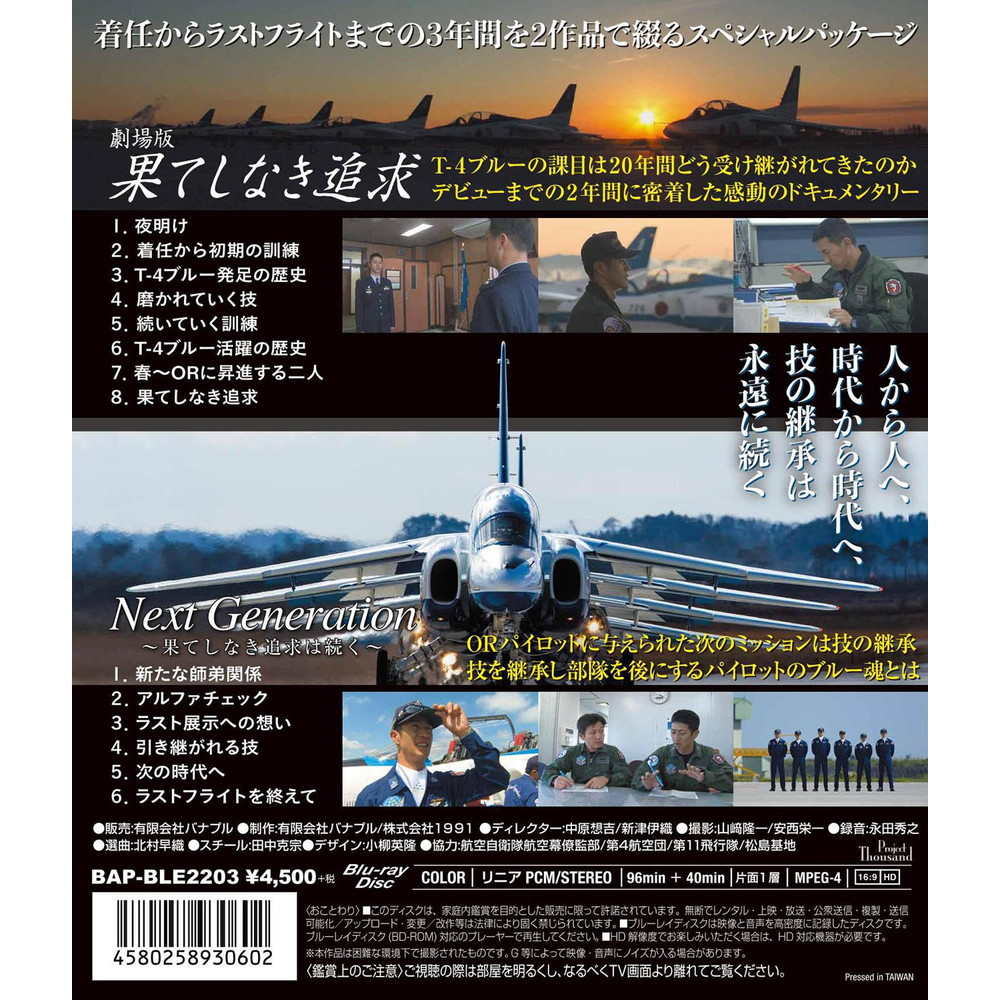 スペシャルパッケージで、ブルーインパルスパイロットの、ブルーインパルスに着任してから卒業するまでの3年間に密着したドキュメン タリーを収録。T4ブルーインパルス劇場用映画第2弾『劇場版 果てしなき追求』をノーカットでお楽しみいただけます。T-4ブルー インパルス創設20周年イヤーにデビューするドルフィンライダーが、着任し練習を経て、航空祭デビューを果たすまでの2年間に密着 した感動のドキュメンタリーです。