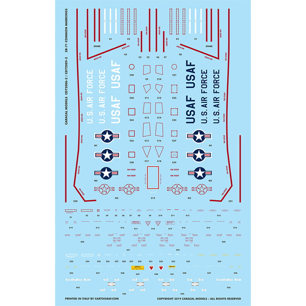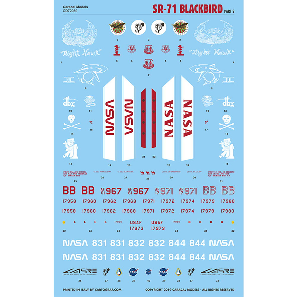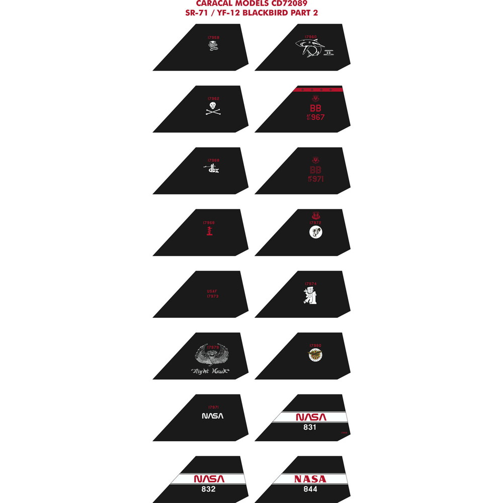 このセットは1966年から98年まで運用されたアメリカ空軍の高高度超音速戦略偵察機、 SR-71/YF-12のマーキングを収録しています。主に後期に運用されていた機体のマーキングから 16機のマーキングをセレクト。尾翼に描かれたマーキングが魅力です。収録マーキングの中に はNASAで運用された機体のマーキングも含まれています。
