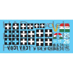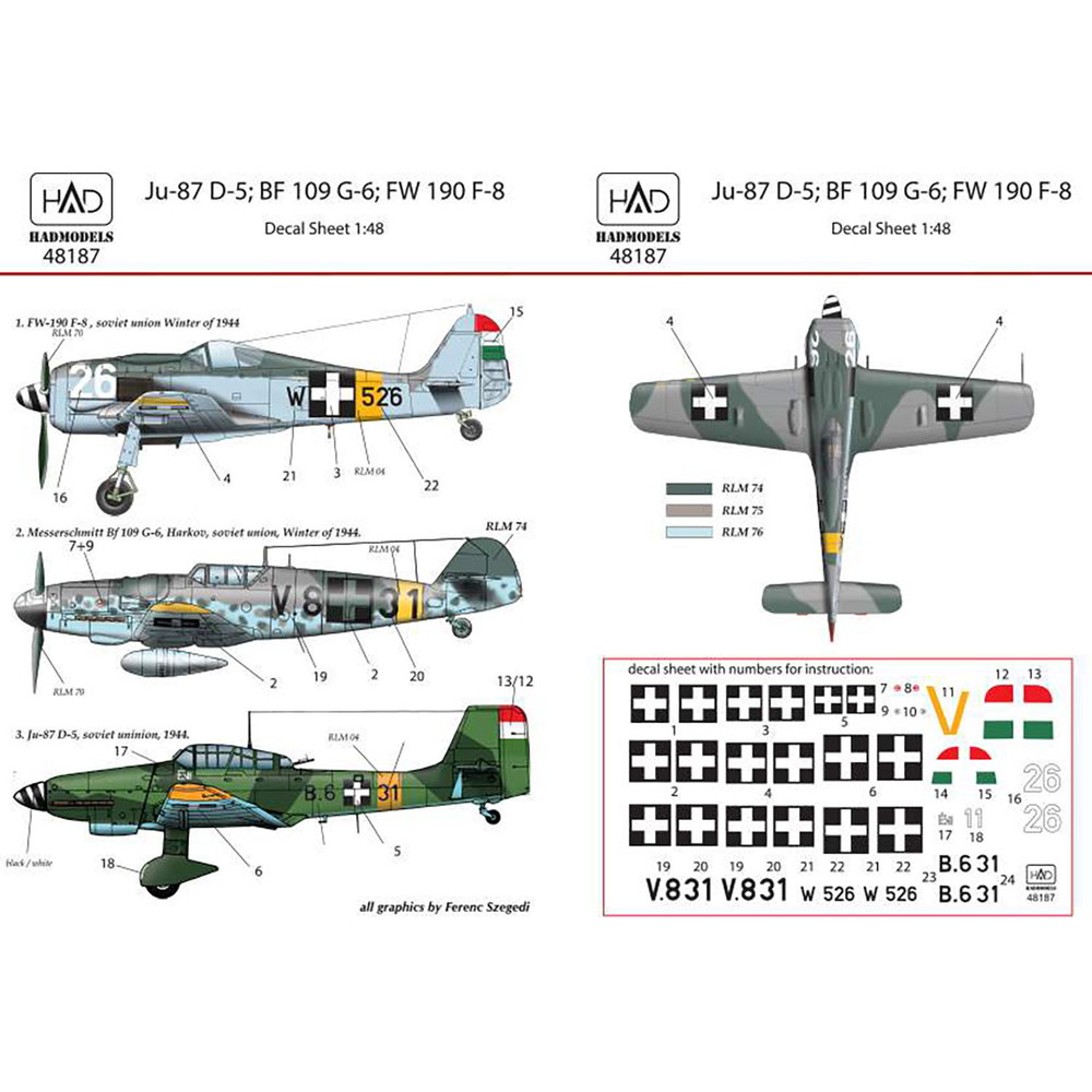1/48スケールのフォッケウルフFw190F-8、メッサーシュミットBf109G-9、 ユンカースJu-87D-5の各モデルに対応したデカールのセットです。