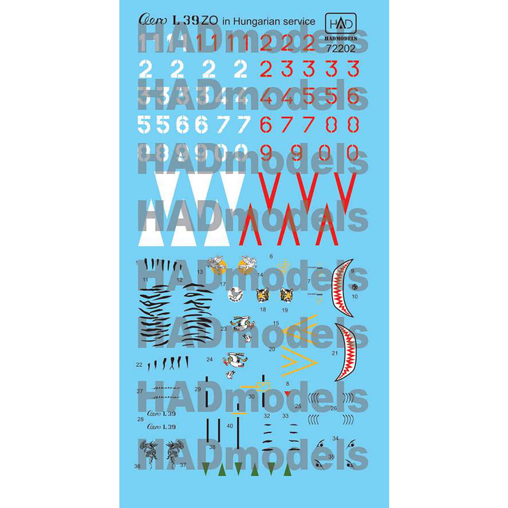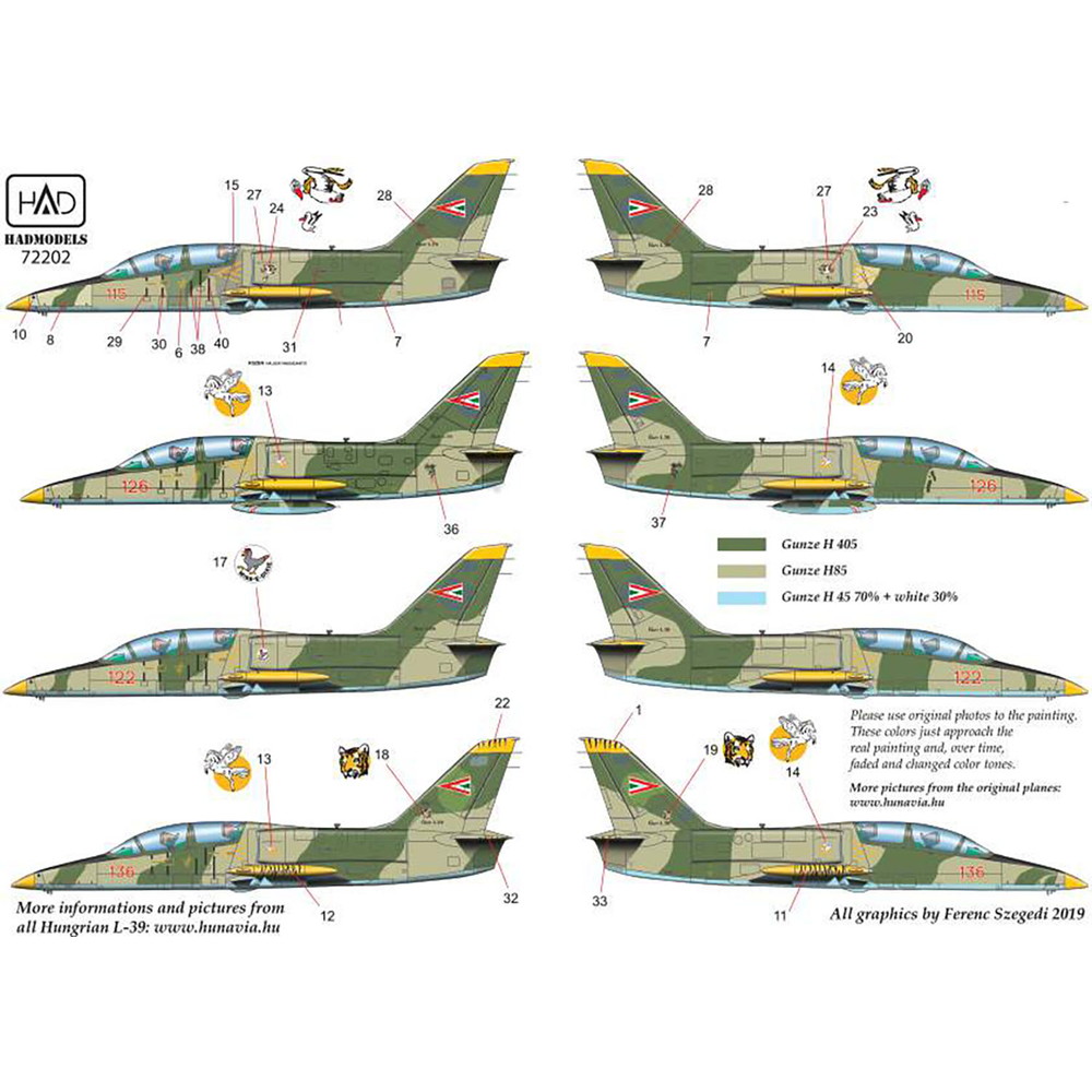 このセットはHADモデルが地元、ハンガリー空軍が運用する練習機、 L39 ZOの機体と旧東ドイツで運用した機体からそのマーキングを セレクトして再現しています。4機のマーキングが収録されています。