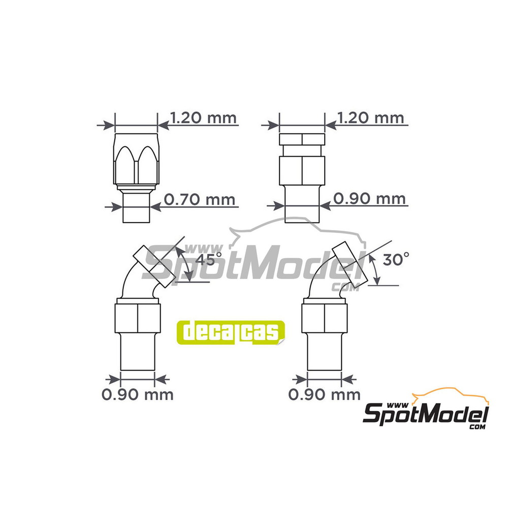 再現しているのは自動車やバイクのブレーキや冷却システム、あるいは燃料系などのパイピングに見られる継手部分、 ホースジョイントをモデル化しています。ジョイントの出口部分の直径は1.2mm。ジョイントのパイプ部分のアングルは45度と30度タイプの 2タイプと真直ぐなタイプも用意。それぞれの場面で使い分けていただけます。