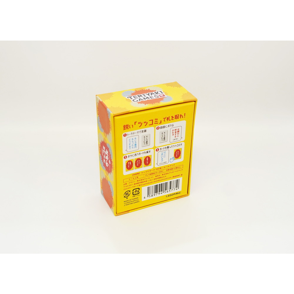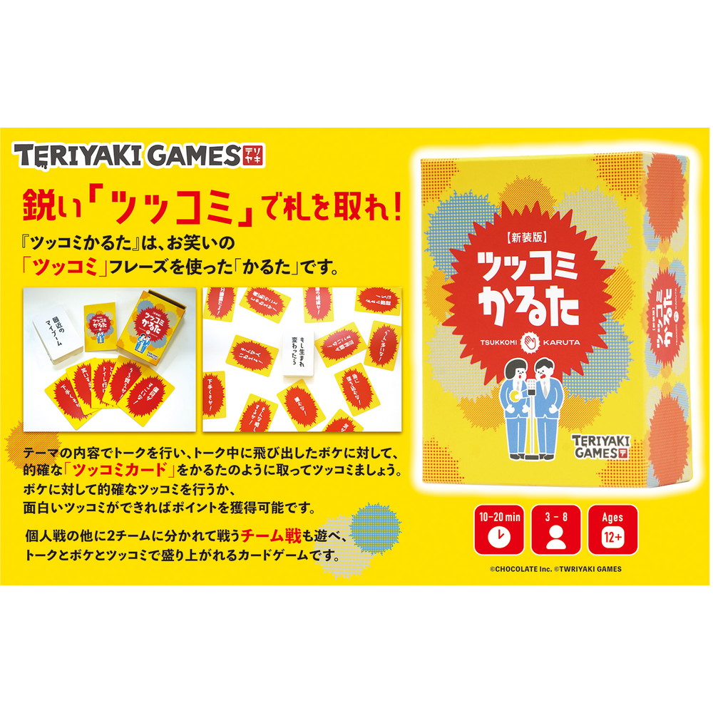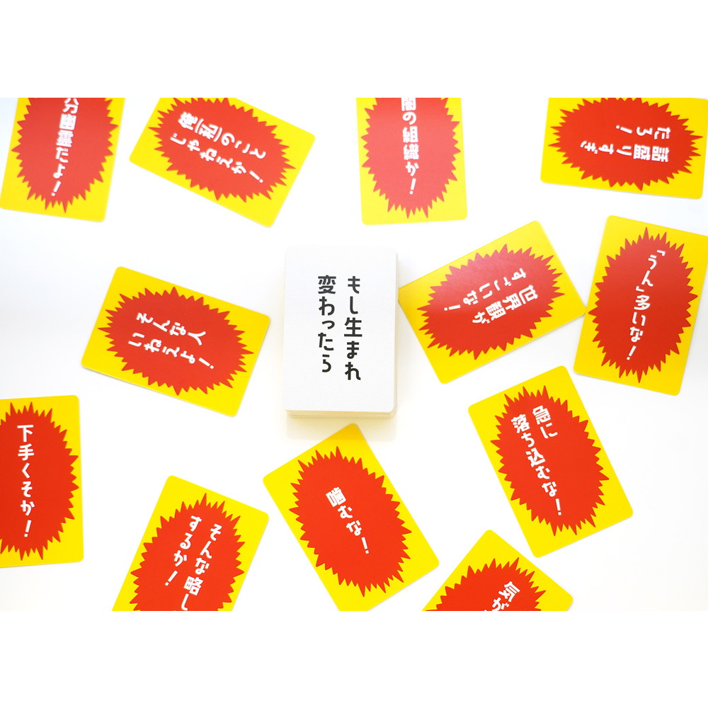 個人戦の他に2チームに分かれて戦うチーム戦も遊べ、トークとボケとツッコミで盛り上がれるカードゲームです。