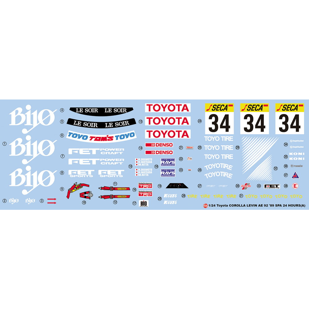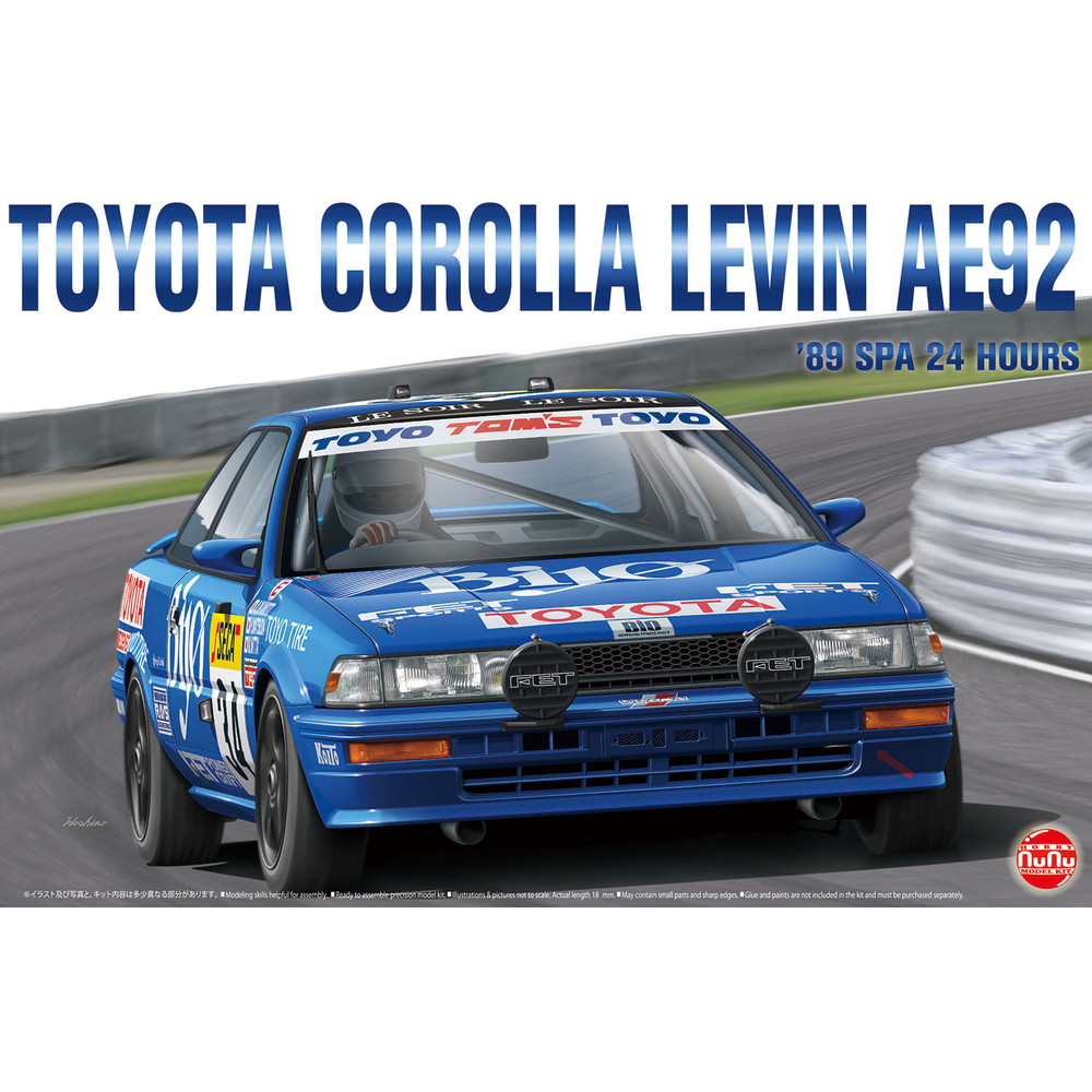 1989年のスパ24時間レースでクラス3位に入賞したトヨタ カローラレビンAE92を1/24スケールで再現したプラスチックモデル組み立てキットです。