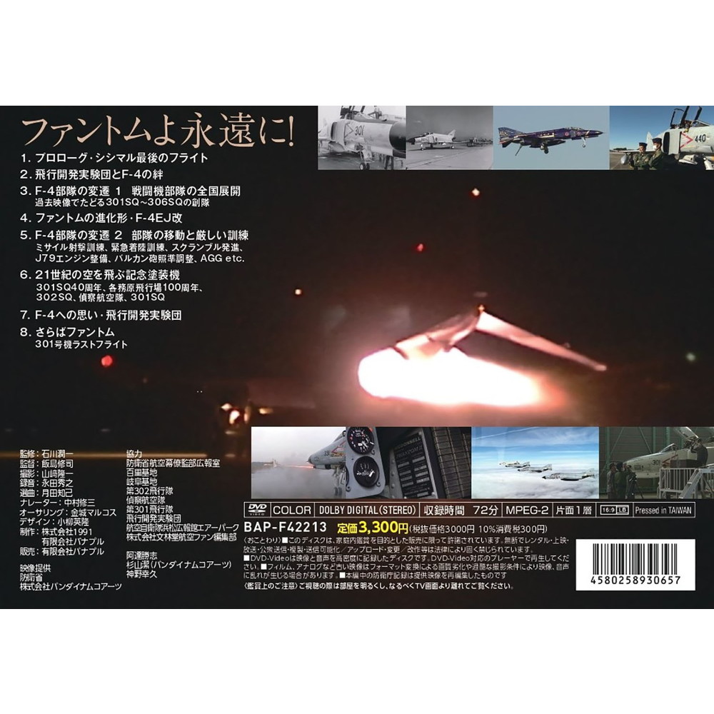更に301号機の特別塗装を始め、301飛行隊創設40周年記念塗装機、飛行開発実験団各務原飛行場100周年記念塗装機、ファイナルイヤーの302飛行隊、偵察航空、301飛行隊の記念塗装も徹底収録した。 石川潤一氏監修の下、最新の高画質映像と歴史的記録で綴るファントムの50年全てが収録されたファントムファン必携のDVD。
