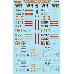 1980年代後半、イギリス・ベントウォータース基地に展開していた米空軍のアグレッサー(演習・訓練時に敵機・敵部隊をシミュレートする専門部隊)部隊のデカールセット。尾翼の赤い帯や胴体の赤い数字がソ連機を意識したマーキングになっています。