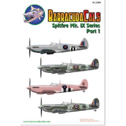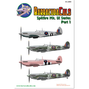 用された単発レシプロ単座戦闘機「スピットファイア」のデカールセット。第131飛行隊に所属のMk.HFVII、第124飛行隊所属のMk.HFVII、第16飛行隊所属のMk.FRIX、第412飛行隊所属のMk.IXcの全4機分が収録。