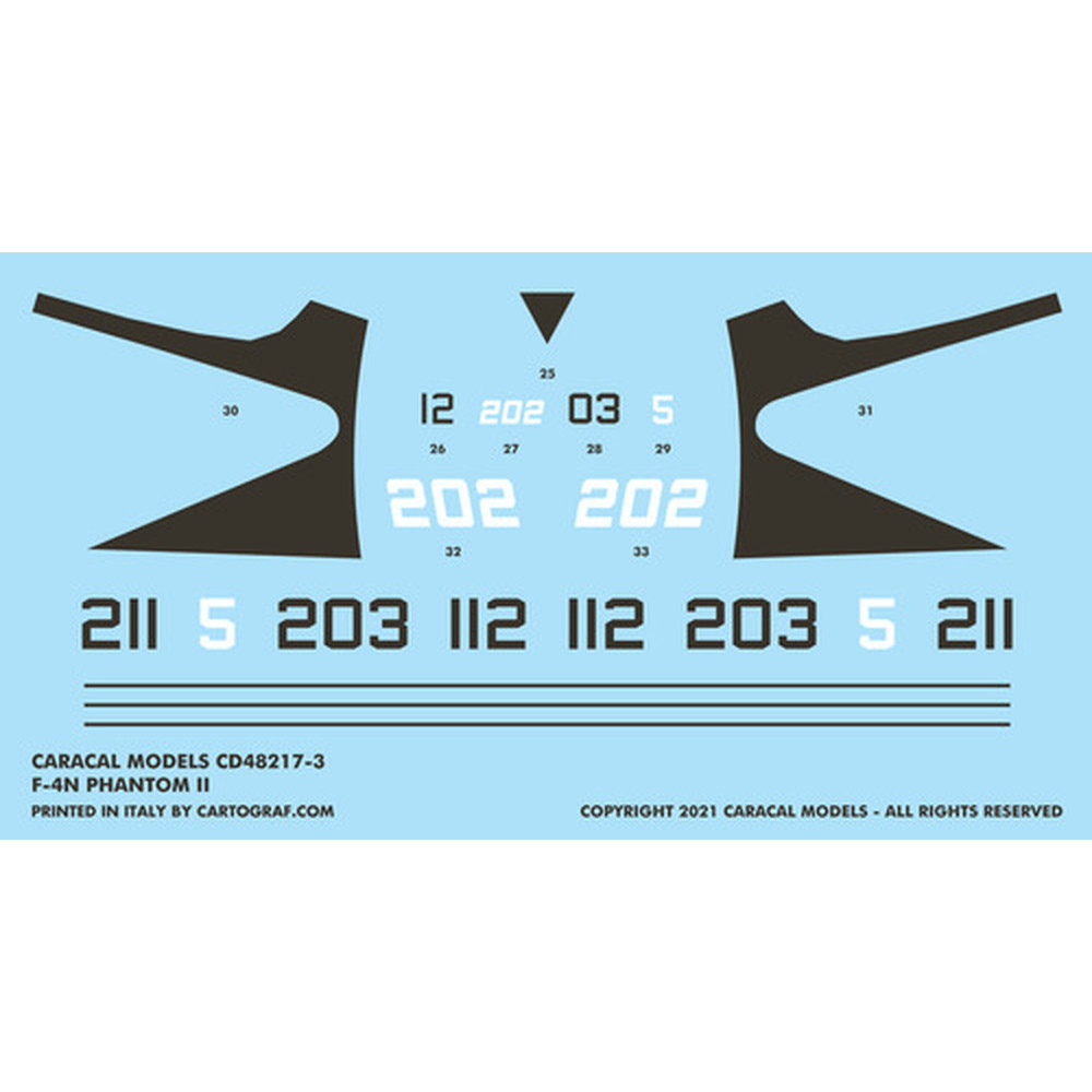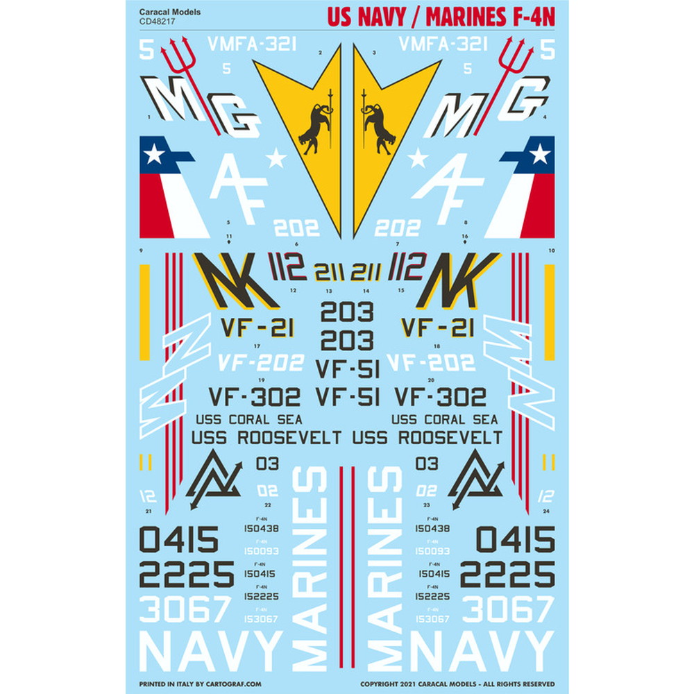 このセットはアメリカ海軍、海兵隊の運用した最後のファントムのバージョンのひとつ、 F-4Nのマーキングを収録しています。1970年代から80年代にかけての 非常にカラフルなマーキングの中から特徴的なマーキングをセレクト。色鮮やかな尾翼のマーキングが魅力的です。 このセットには下記のマーキングを収録。ステンシル類は1機分をセットしています。
