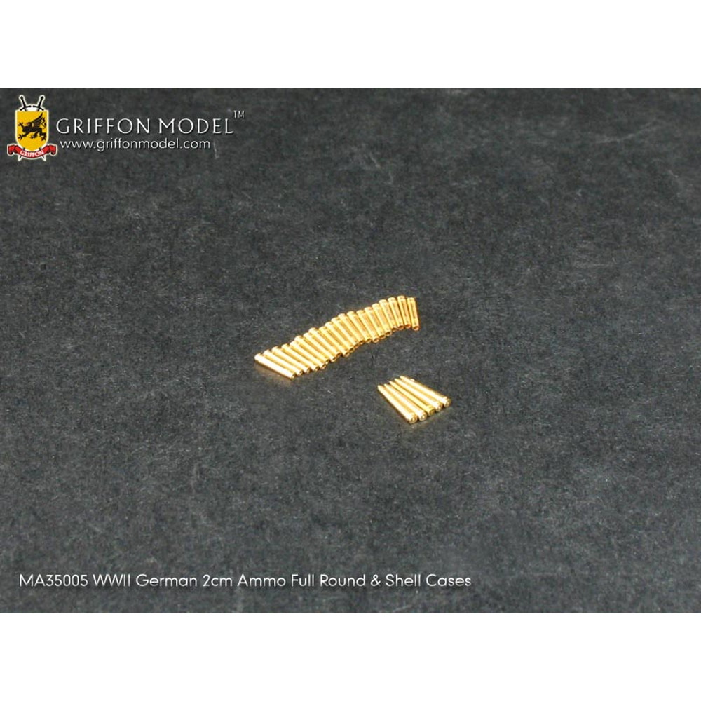 第二次大戦でドイツ軍が開発、多数が配備された砲のひとつ、2cm砲は地空機関砲Flak38をはじめ、II号戦車の主砲としても装備されていました。このセットでは2cm砲の砲弾、および、薬莢を再現した金属パーツを用意。砲弾で約5mm、薬莢は約4mm。その形状はもちろん、細部のディテールも表現されリアルな仕上がりです。砲弾パーツは5個、薬莢は20個がセットされています。1/35スケールの各2cm砲のモデルや2cm砲搭載車量などと組み合わせて情景製作等に便利に使っていただけるセットです。