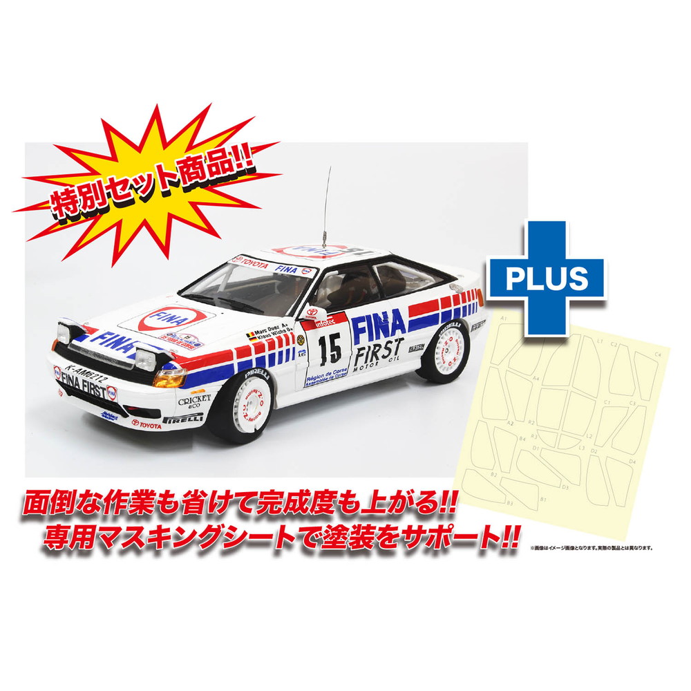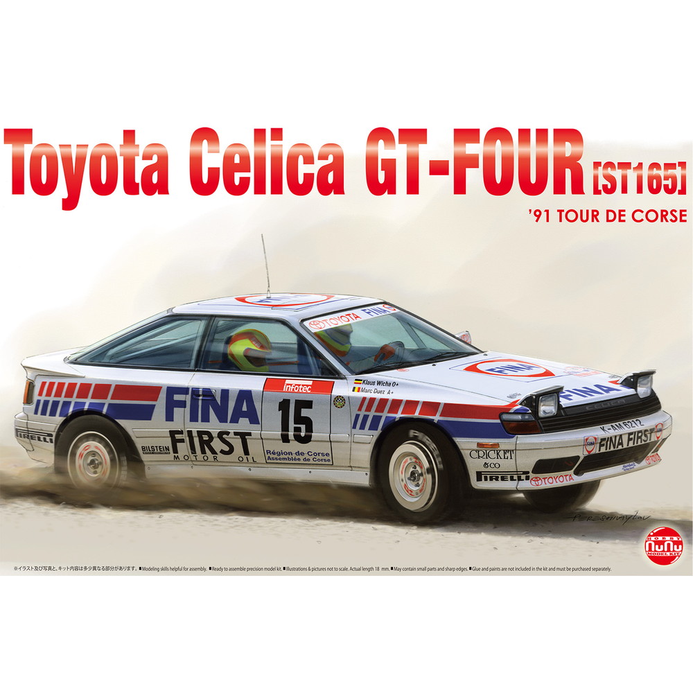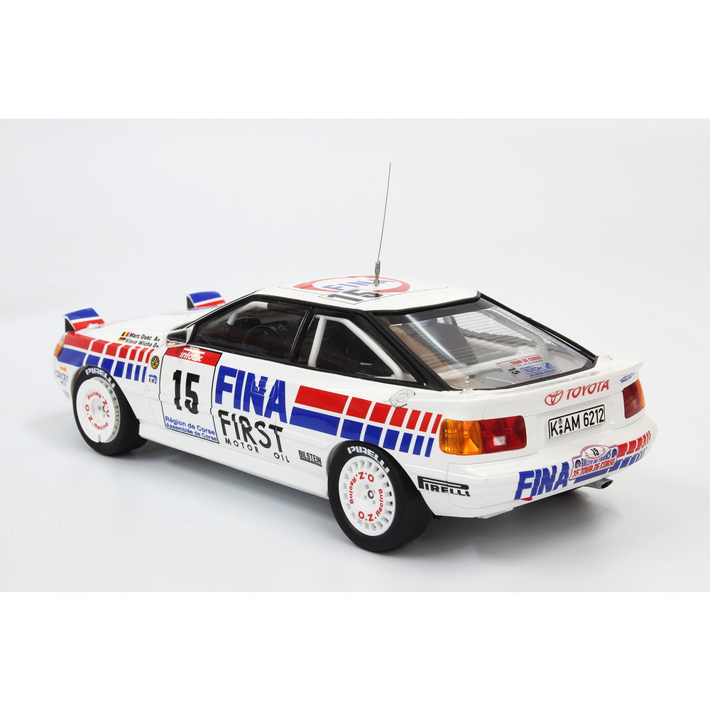 1991年の世界ラリー選手権の第5戦、ツール・ド・コルスでトヨタFINAチームのマルク・ デュエツがドライブして4位に入賞したトヨタ セリカ GT-FOUR ST165 ラリーを再現したプラスチックモデル組み立てキットです。