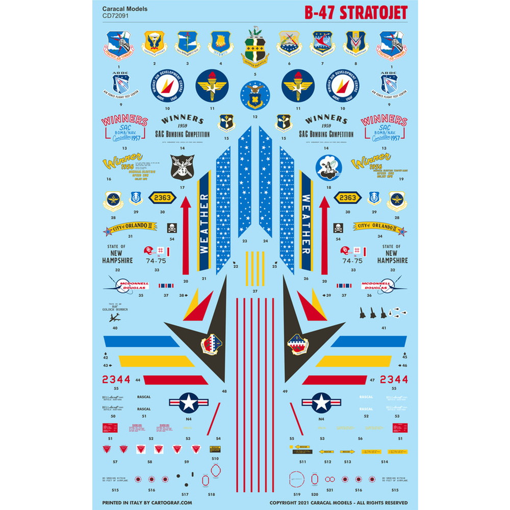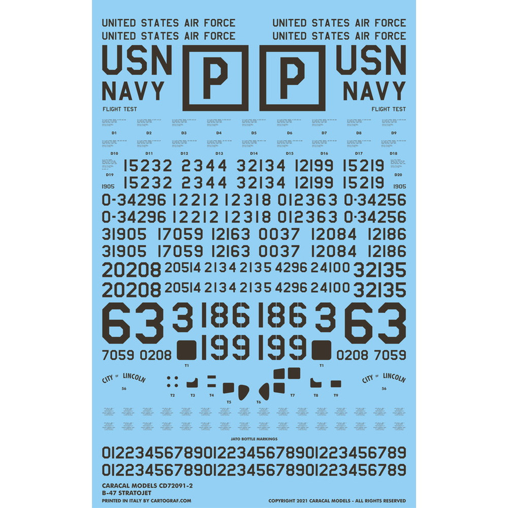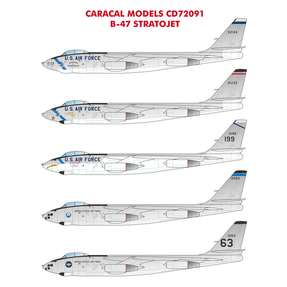 このセットは第二次大戦直後にアメリカが開発、1951年からアメリカの戦略空軍に配備、冷戦初期、196年代末期まで活躍した戦略爆撃機、B-47ストラトジェットのマーキングを収録しています。
