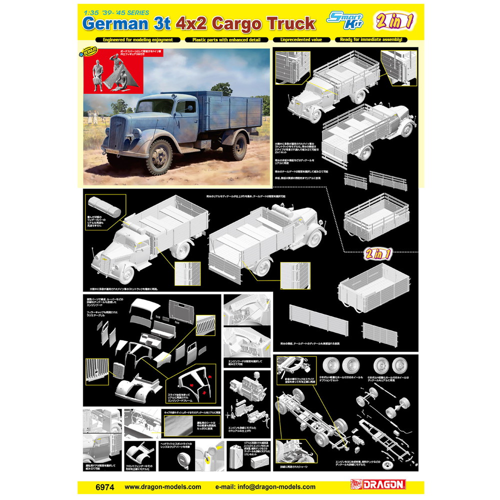 ドイツで生産された後輪2輪駆動の3トントラックはもっとも代表的なトラックのひとつで、生産台数は13万台以上とも言われ、各地で活躍。各種物資の輸送や補給の役割のほか、ヘインの移動や、さらにそのプラットフォームを利用して荷台部分に火器類を搭載した各種自走砲もバリエーションタイプとして製作された記録も残されています。