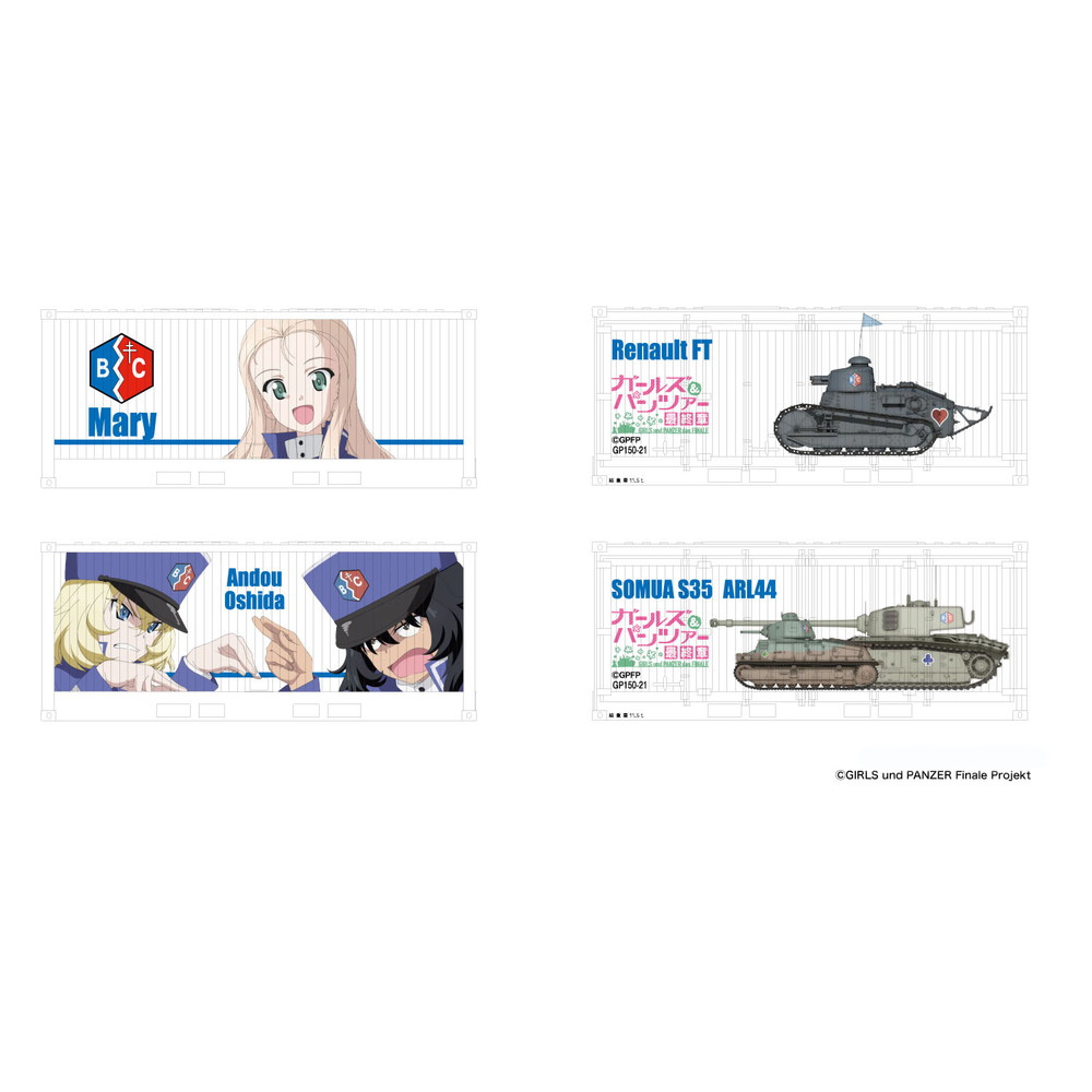 コンテナの片方の面にはメンバーのイラスト、そしてもう一方の面には彼女たちが搭乗する車輌が描かれます。これまでの12ftタイプよりも大型のコンテナは側面いっぱいに描かれた彼女たちの笑顔が見逃せません。