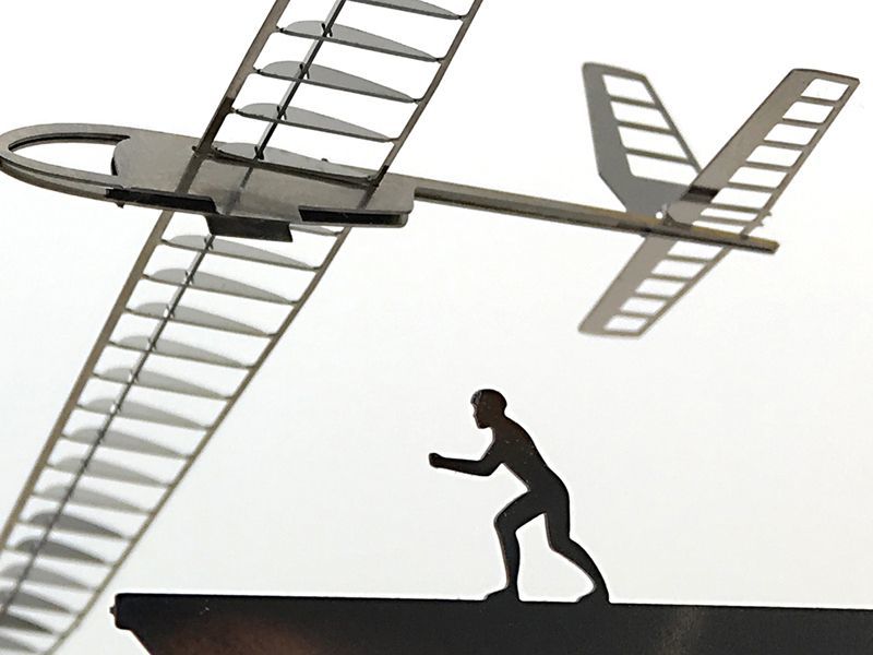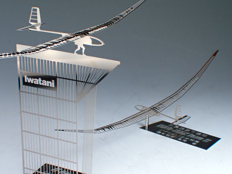 モデルは三鷹市の青年サークル、三鷹青年団体連絡協議会が主になって立ち上げたチーム、三鷹茂原下横田が参戦した鳥人間コンテストの滑空機部門で見事優勝を果たした機体、MAG MAXI evoIIを1/144スケールで再現。この機体は日本の琵琶湖を舞台に毎年開催されている人力飛行機の大会「執り人間コンテスト」で優勝を記録している機体のひとつです。1998年の大会ではスタート地点から対岸までの飛行に成功。その後は飛行距離の世界記録を目指して開発、挑戦が続けられたのです。