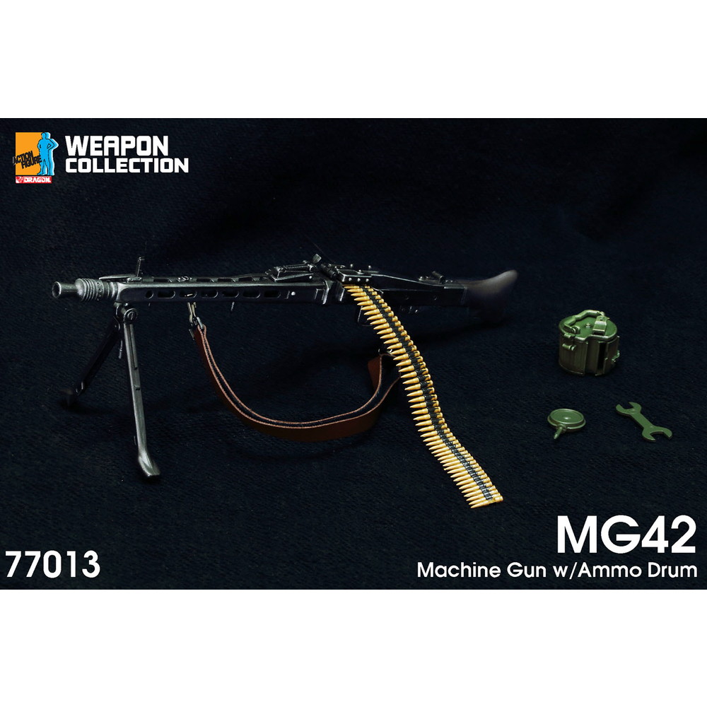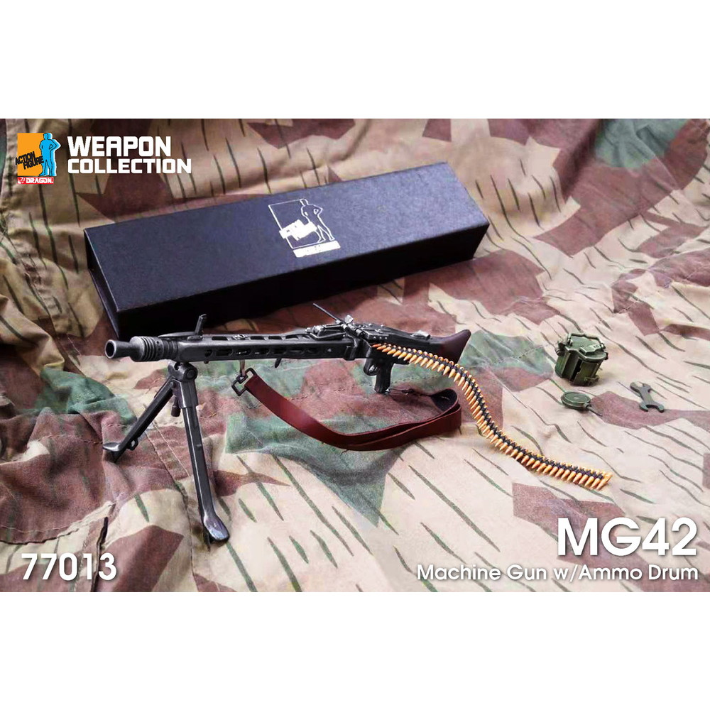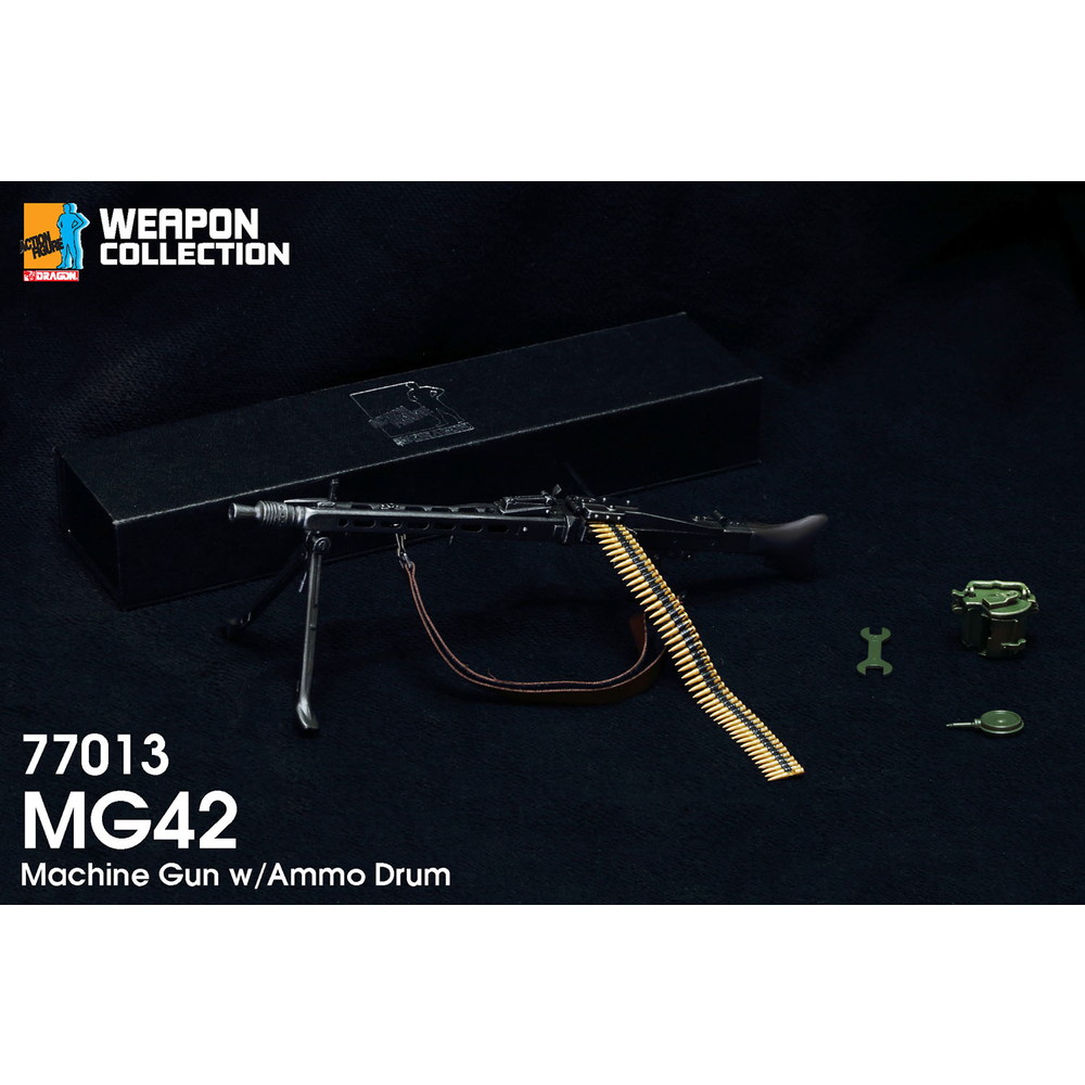 1/6スケールアクションフィギュアに使えるアクセサリーパーツです。1/6スケールでドイツ軍が第二次大戦で運用した機関銃、MG42を再現したモデルです。 1942年から生産が開始され、ドイツ陸軍によって1943年から正式採用された機関銃がMG42です。多くのパーツが金属プレス加工のパーツとされ、優れた生産性を生み出しました。その結果大戦中5つのメーカーで合計約40万挺が生産されたと言われています。射撃速度は毎分1200発を誇り、威力も十分でした。その設計は戦後の多くの機関銃に多大な影響を及ぼしているのです。 モデルは1/6スケールでMG42機関銃を再現。塗装組み立て済みで、パッケージから出してそのままアクションフィギュアにあわせることができます。金属の質感を表現した塗装はシルバーのドライブラシも施され、リアルな仕上がり。全長は20.5cm。スチールのプレス加工で製造されたフレームや木製のハンドガードなど、質感の違いも雰囲気たっぷりに表現。ストックや弾倉、トリガー部分などにいたるまで繊細なディテールが実感十分です。また、二脚やガンサイトは可動。さらに、ベルト式弾帯のほか、ドラム式弾倉もセット。銃への着脱が可能です。ブラックのシックなケース入り。フィギュアとの組み合わせだけでなく、火器モデルのコレクションにも楽しいサイズとディテール表現です。