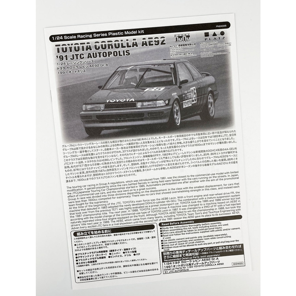 1991年のJTC、全日本ツーリングカー選手権レースで活躍したトヨタ カローラレビンAE92グループA仕様を1/24スケールで再現したプラスチックモデル組み立てキットです。