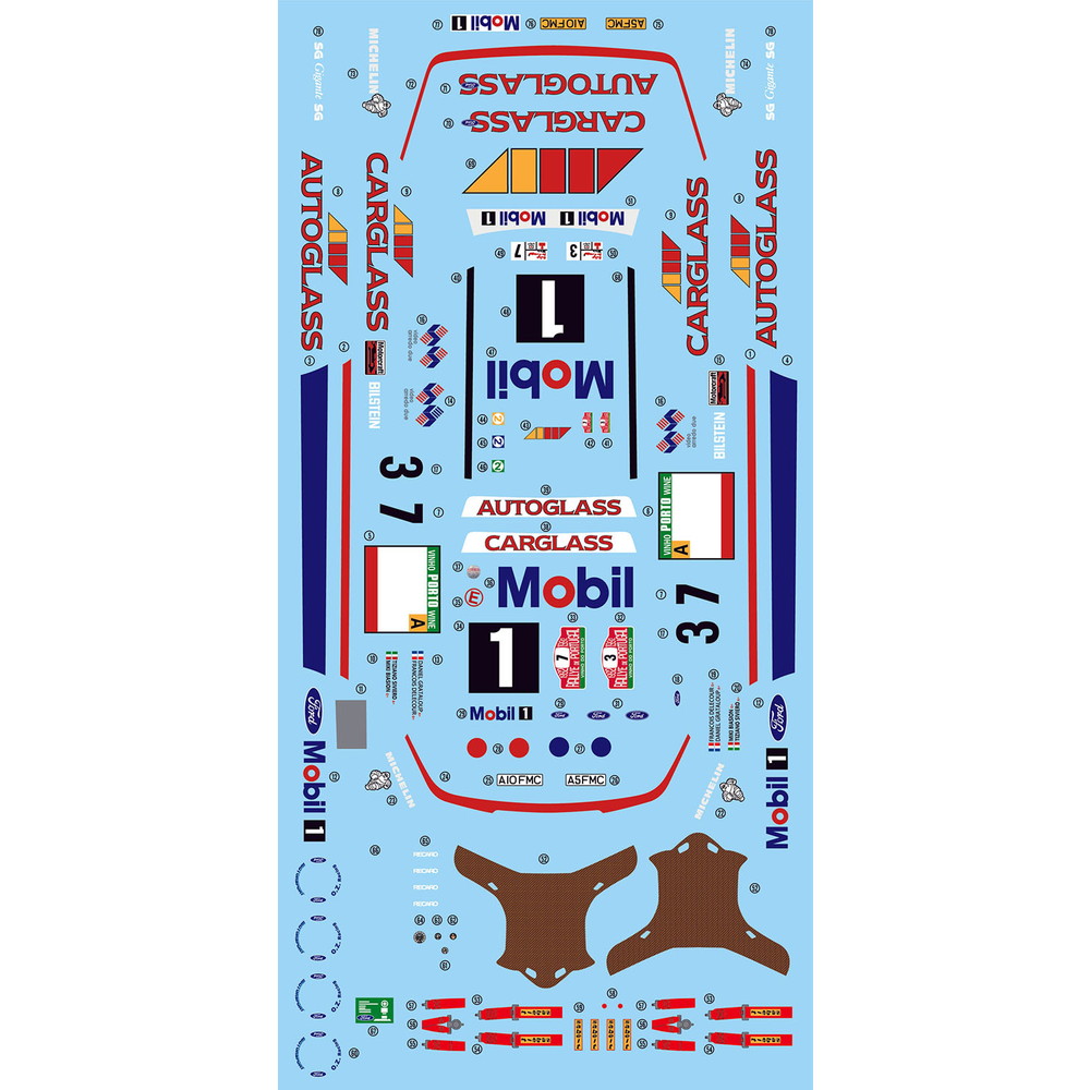 マーキングは1992年のポルトガルラリーに参加したフォードワークスチームのマーキングをデカールで再現。メインスポンサーのモービル1のロゴやフォードのブルーオーバルロゴ、ミシュランなどをしっかりとセット。カーナンバーは2位に入ったミキ・ビアシオンがドライブした3のほか7も用意。選んで仕上げていただけます。