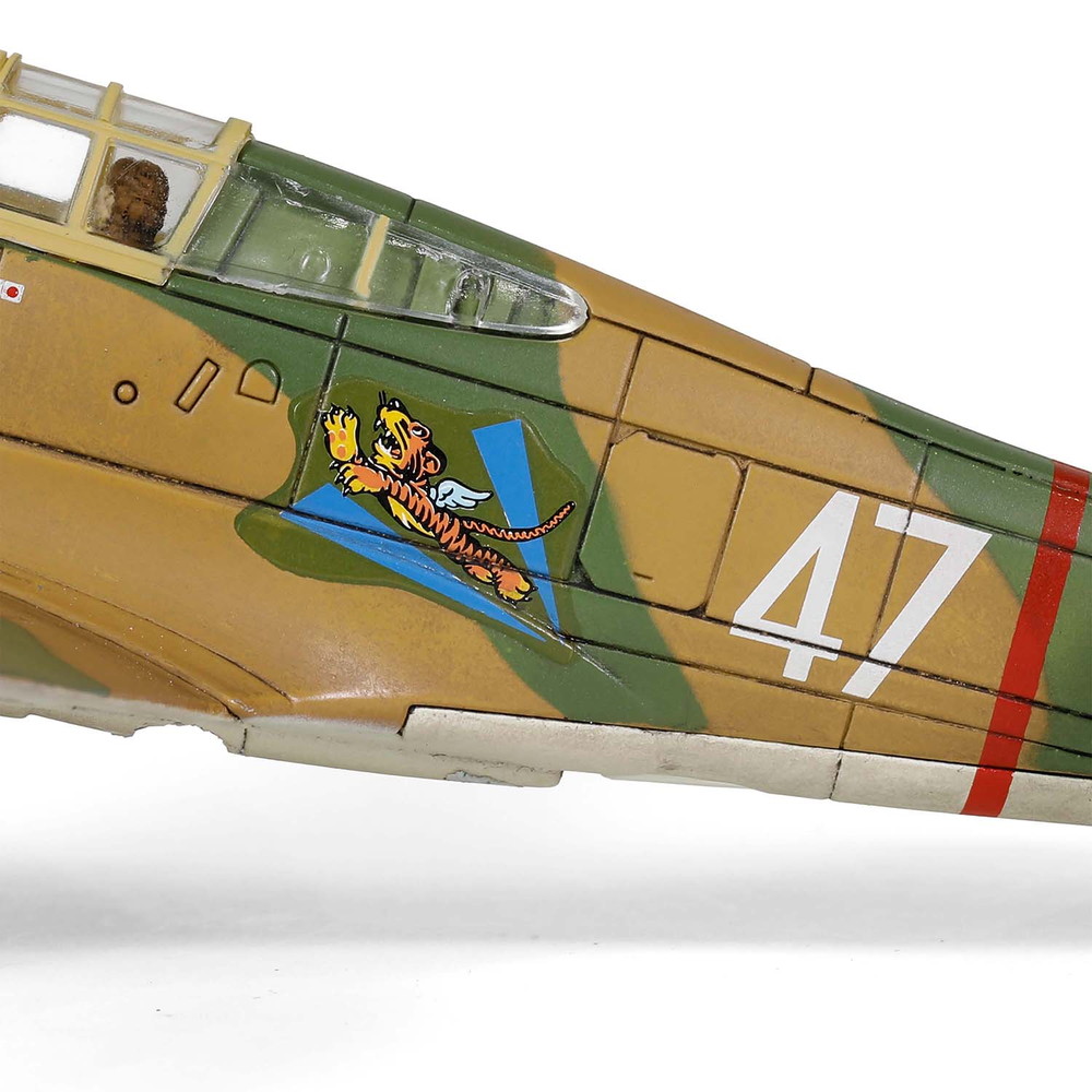 もちろんキャノピーから覗くコクピットの内部にはパイロットのフィギュアも セット。マーキングは1942年に中国大陸で活躍したアメリカ軍第3追撃飛行隊の ロバート・スミスが搭乗した機体番号47を再現。超精密タンポ印刷による マーキングなど、ミリ単位までこだわった塗装仕上げも見逃せません。