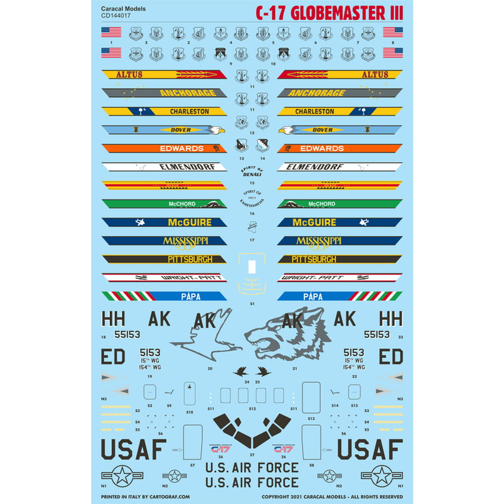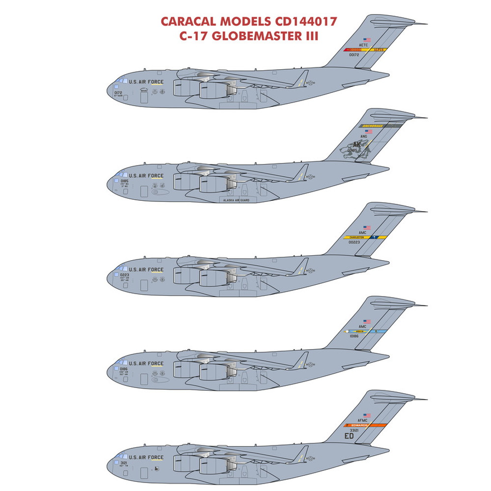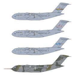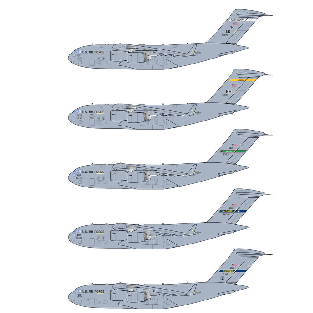 このセットはアメリカ空軍が運用している輸送機で1993年に導入され、アメリカが関与したほぼすべての作戦に参加しているC-17グローブマスターIIIの機体のマーキングを収録しています。