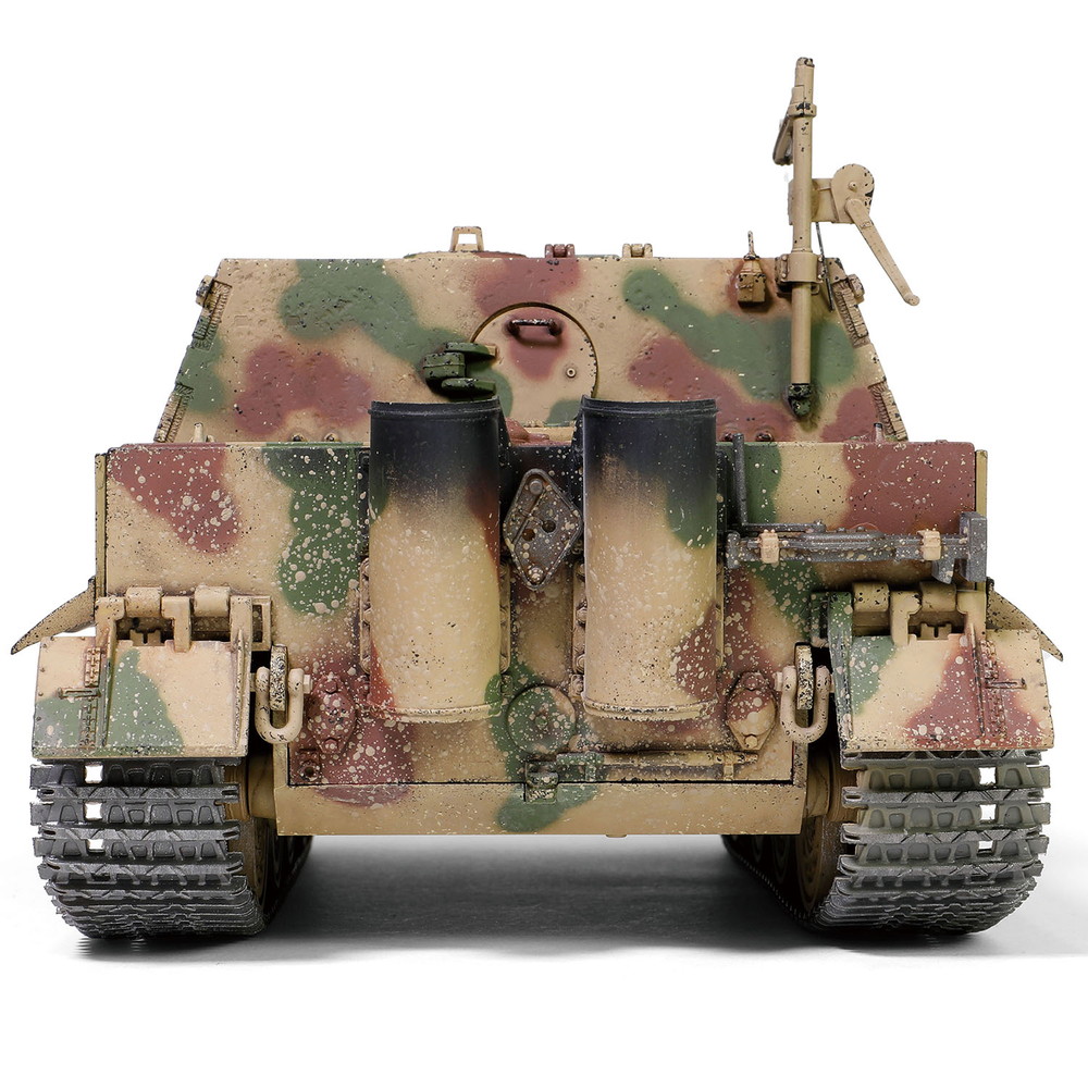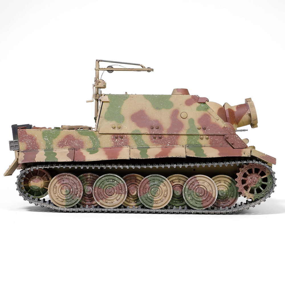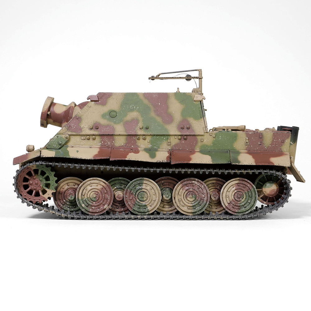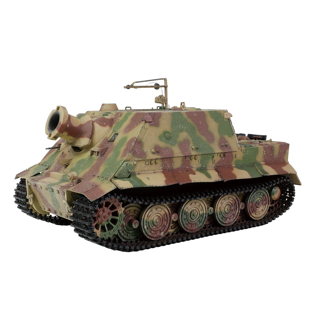 リアルに再現された車体は砲塔上部、車体上部、防盾はダイキャスト製。38cm臼砲の砲身はアルミパーツ。さらに、履帯は金属製の連結式。サスペンションとともにサスペンションとともに可動が楽しめます。
