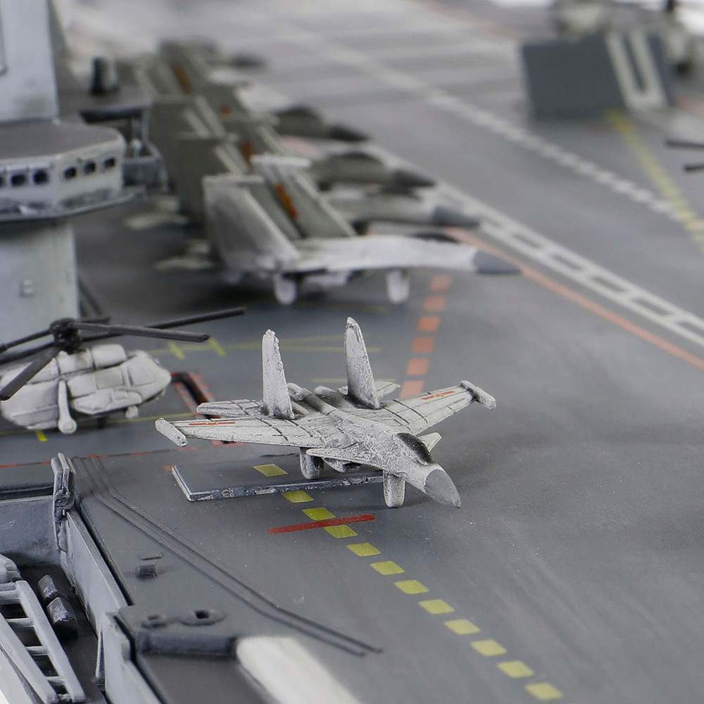 ●艦載機はKa-31×1、Ka-27×1、ブレード収納状態のZ-8×1、J-15×4、J-15主翼折りたたみ状態×4