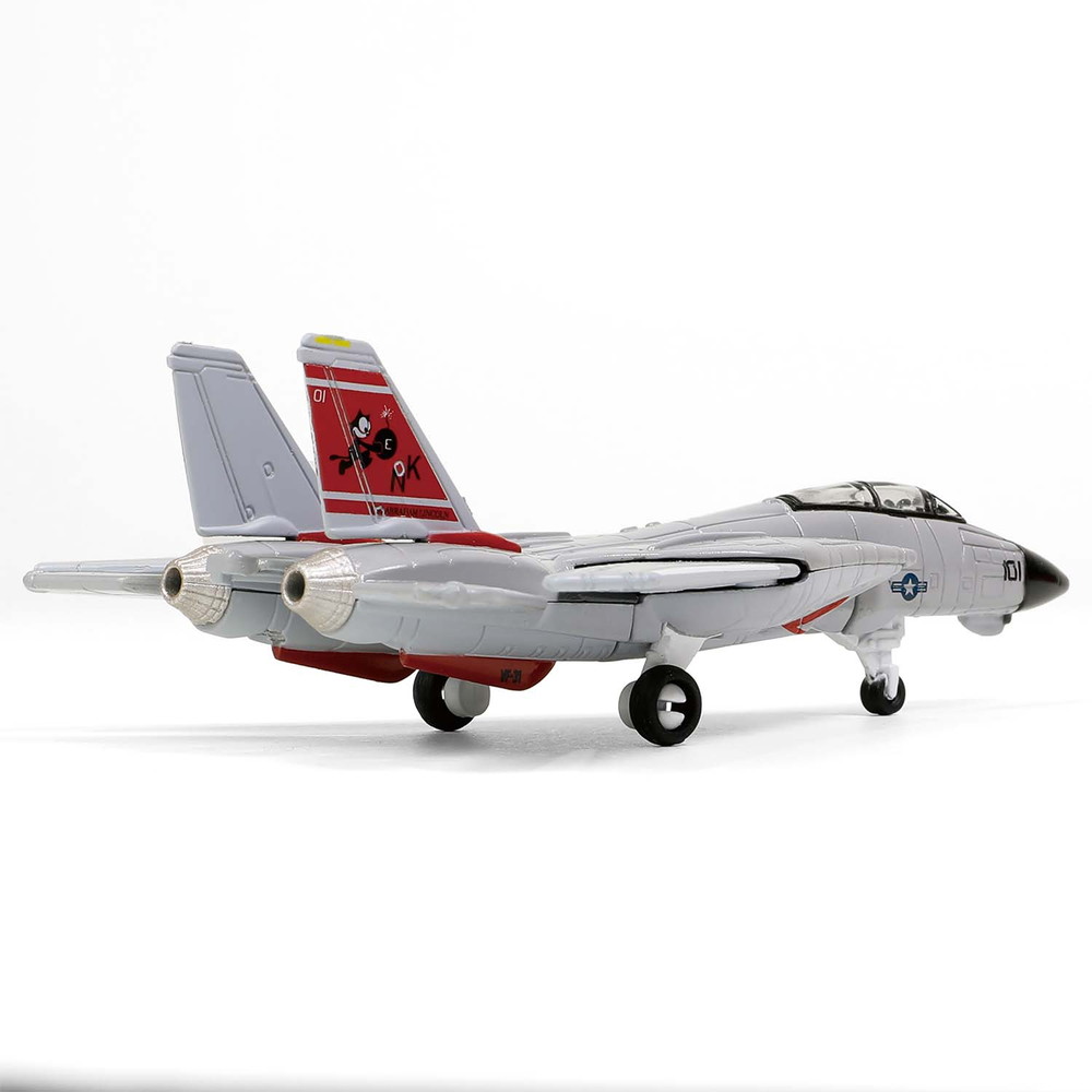 F-14トムキャットは全長約10cmで再現された塗装済みの完成品。おなじみのキャラクターのイラストを尾翼に描いた機体は各部のマーキングを精密なタンポ印刷で表現。