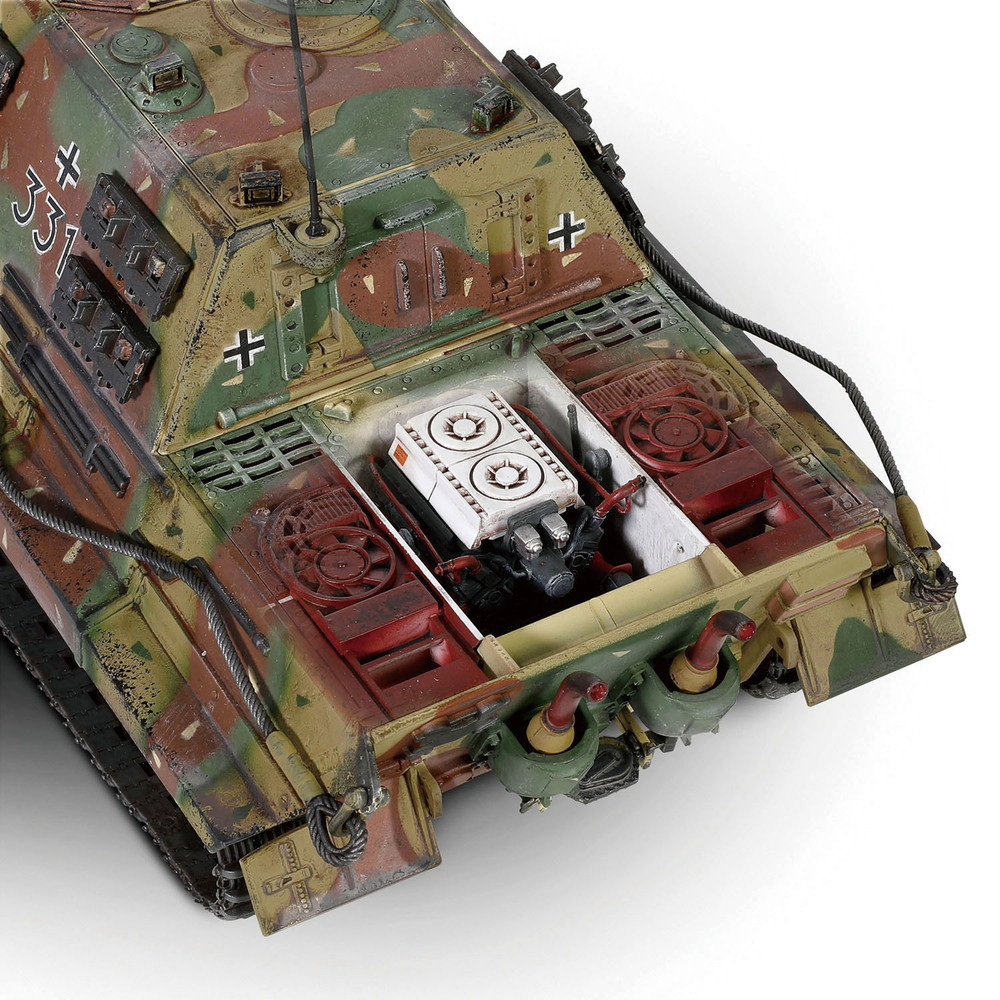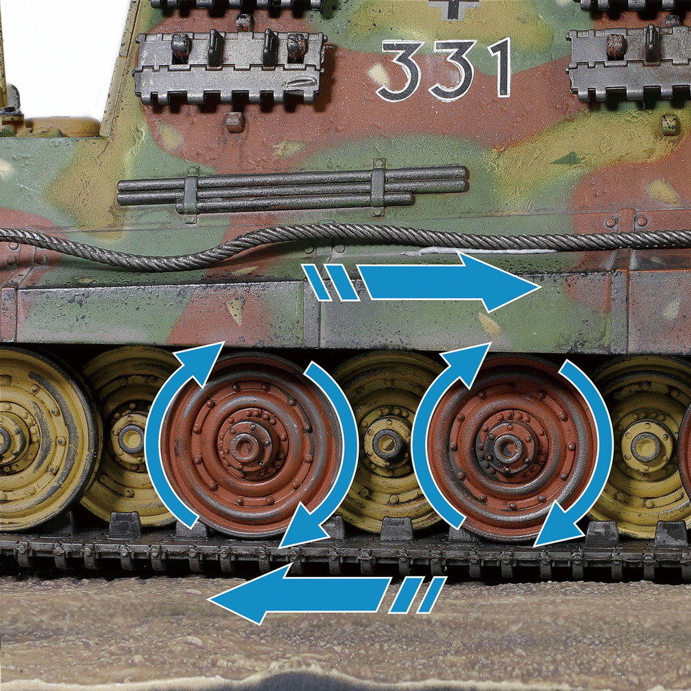 エンジンは車体から取り外してエンジンラックに展示することもできます。履帯は樹脂製。ヘンシェルサスペンションを再現した転輪とともに可動も楽しめます。