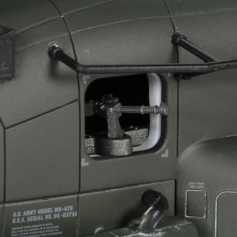 さらに、キャノピーから見えるコクピットも雰囲気十分に表現。加えてエンジンも再現され、メカニカルな仕上がり。もちろんマーキング、塗装はアメリカ陸軍第160特殊作戦航空連隊、通称ナイトストーカーズの機体を再現。