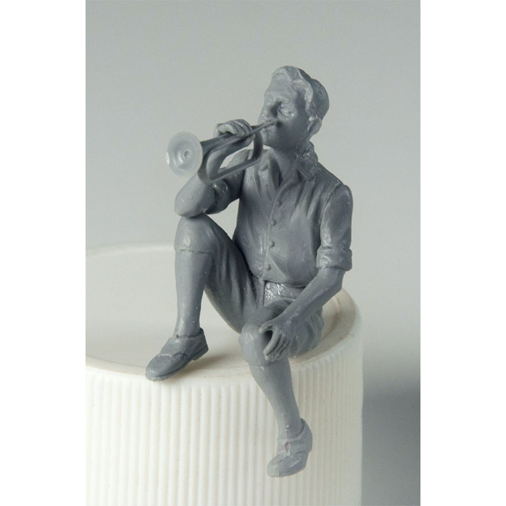 一人はトランペットを持ってそれを自慢気に吹いている様子を再現。続いてくまのぬいぐるみを両手で抱えた少年は半ズボン、半袖シャツで直立したポーズ、さらに、釣竿を持って釣りをしている様子を再現した少年は帽子をかぶって岩に腰掛けたポーズ、そして、静かに本を読む少年に池を覗き込むポーズの少年、さらに、少し年長の少年はバケツと刷毛を持って塗装の手伝いをしているポージング。