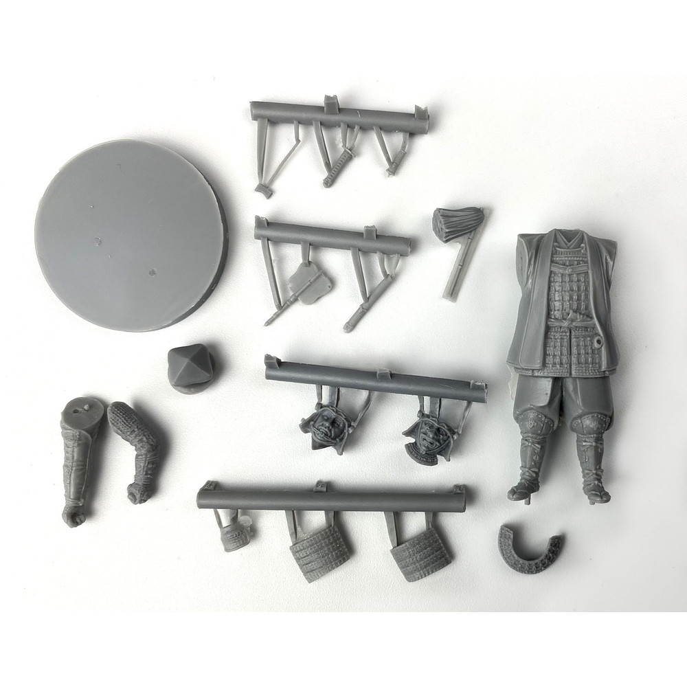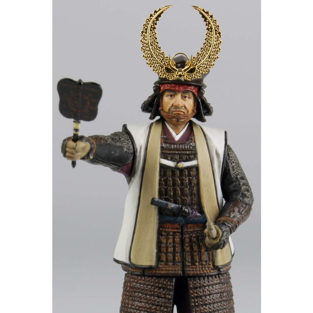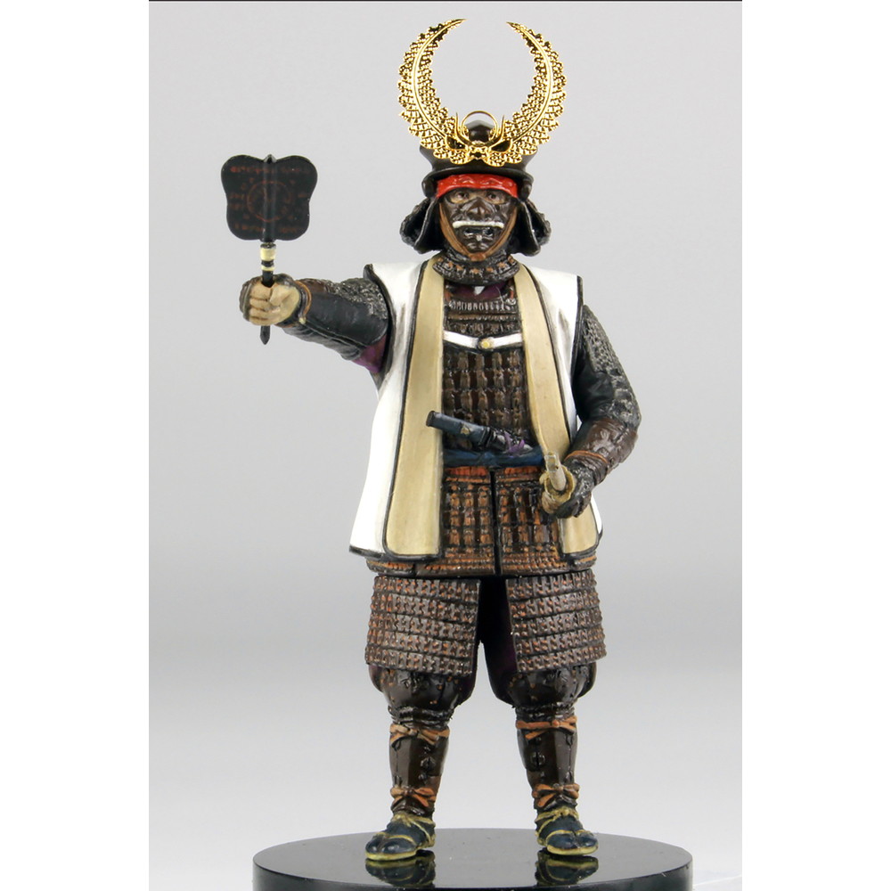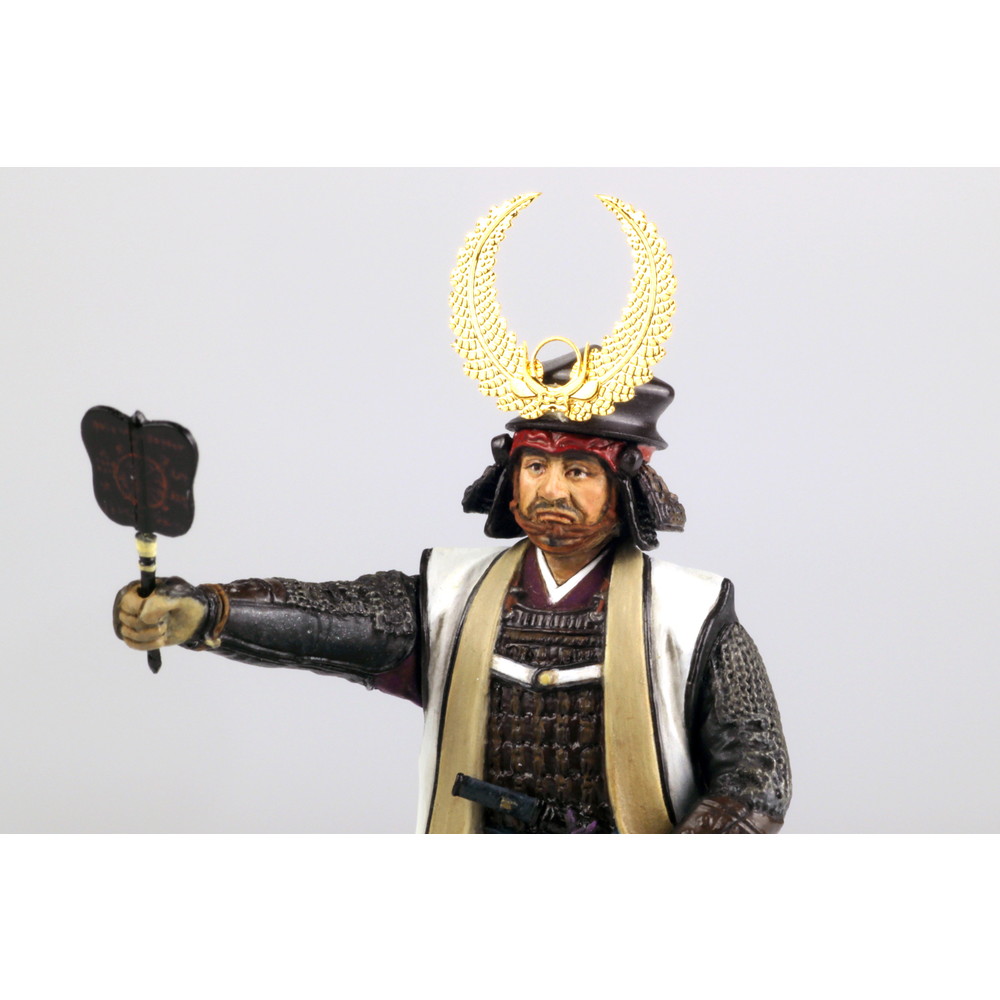 主要部品はレジン製で、レジンならではのディテール表現も仕上がりのリアリティを高めます。前に伸ばした右手は采配、または軍配を選んで持たせることが可能。
