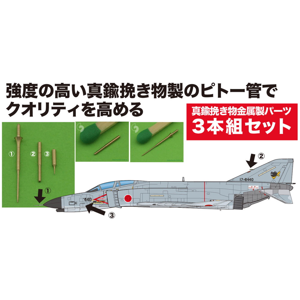 このセットではロングノーズタイプのF-4ファントムとして知られる、F-4E、F、G、EJの各タイプとさらに、偵察機バージョンのRF-4B、C、E、EJファントムの各キットに使用できるパーツで、定評のあるマスター社製の真鍮挽き物金属製のパーツ3本セットです。