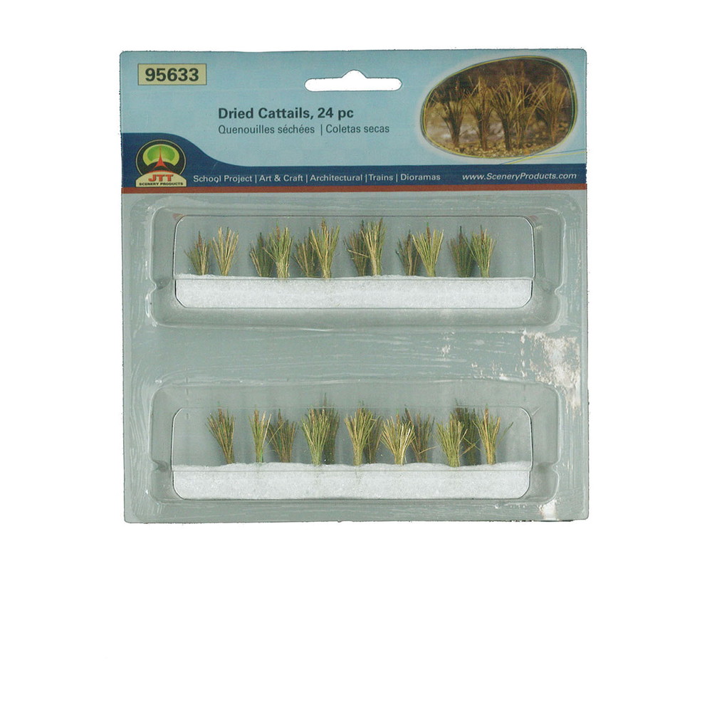 細い刃のような形の葉っぱと茶色の葉巻型の花をしっかりとモデル化しています。高さが 1.9cmの株が24株入っています。池や川などの水辺の情景シーンにリアリティを演出する 素材です。HOスケールサイズで鉄道模型のレイアウトなどにも便利。