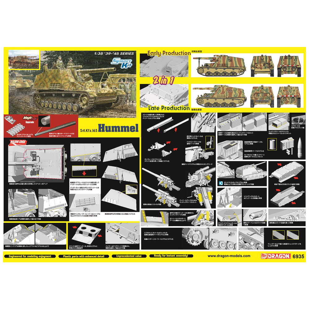 モデルは第二次大戦で活躍したドイツ軍の自走砲、Sd.Kfz.165フンメルを再現した1/35スケールプラスチックモデル組み立てキットです。