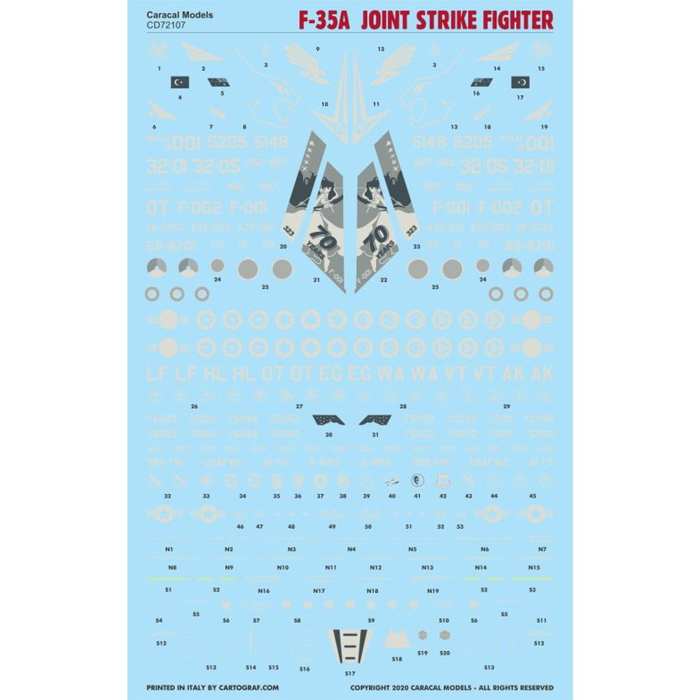 このセットはアメリカで開発された最新鋭のジェット戦闘機、ジョイント・ストライク・ファイターのバリエーションのひとつ、F-35Aのマーキングを収録しています。