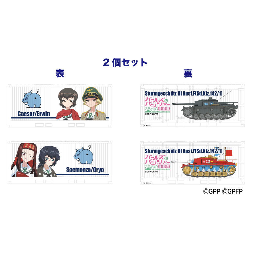 コンテナの片方の面にはメンバーのイラスト、そしてもう一方の面には彼女たちが搭乗する車輌が描かれます。