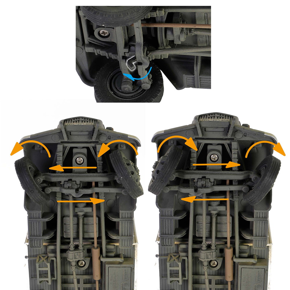 戦場を駆け抜けたタフな走行性能も伝わります。前輪は左右にステアリングも可能。