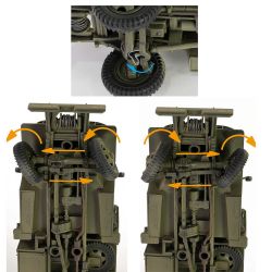 パーツはキャビン部分やシャーシの一部がダイキャスト製、その他がプラスチック製のマルチマテリアルモデル。カーゴトラックの車体形状をしっかりと再現しているのはもちろん、車体下面もシャーシフレームから6輪駆動のドライブトレインやサスペンションなどのメカニズムが詳細に再現され、前輪は左右にステアリングも可能です。