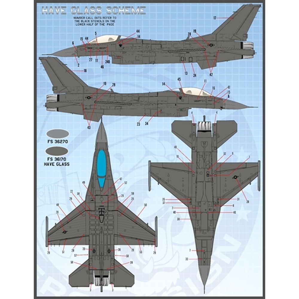 このセットではアメリカ空軍の主力戦闘機として1978年から運用が始められたアメリカ空軍の多用途戦闘機、F-16ファイティングファルコンの機体各部に表記されているステンシルやデータのマークを収録しています。
