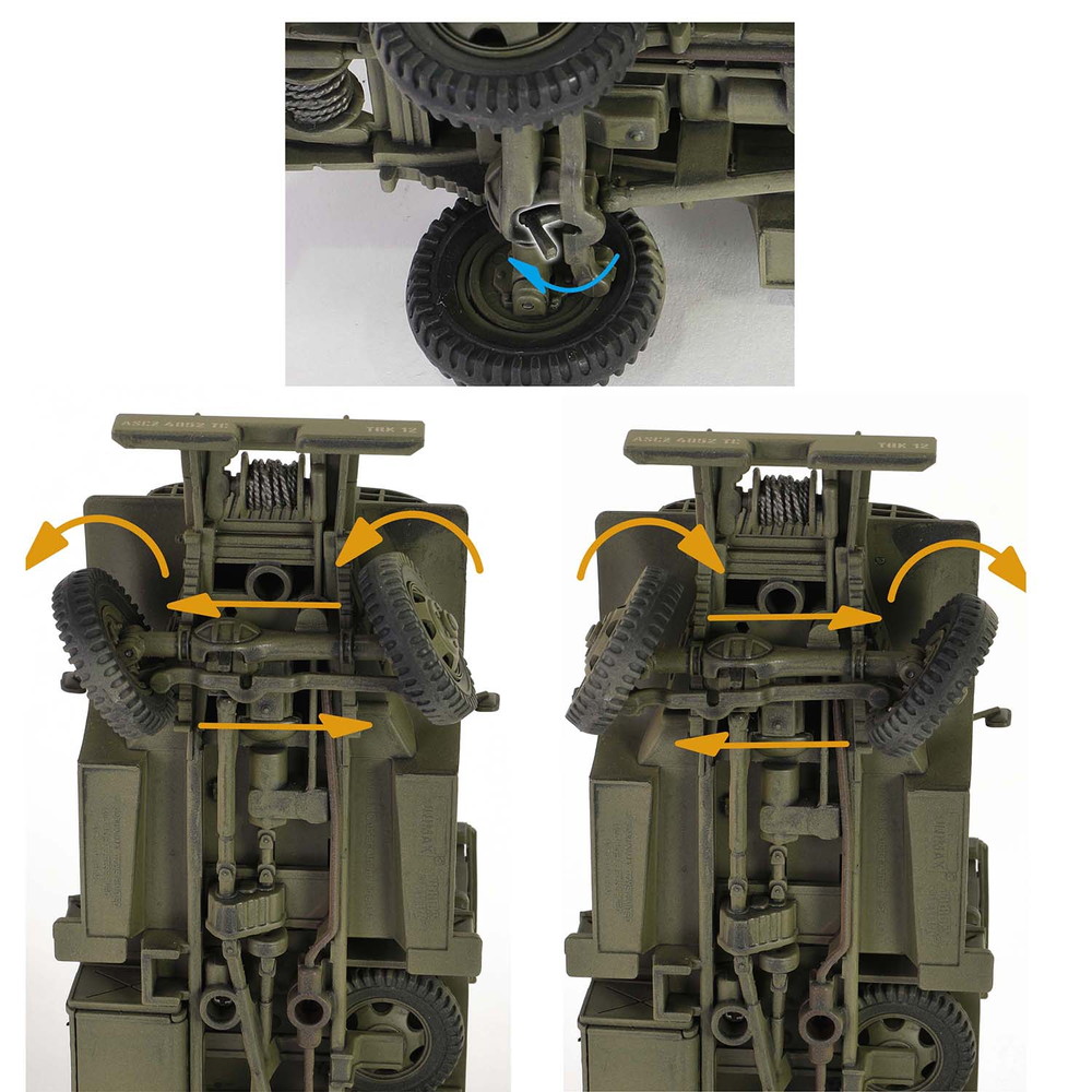 中でも6輪駆動タイプをモデル化しています。パーツはキャビン部分やシャーシの一部がダイキャスト製、その他がプラスチック製のマルチマテリアルモデル。カーゴトラックの車体形状をしっかりと再現しているのはもちろん、車体下面もシャーシフレームから6輪駆動のドライブトレインやサスペンションなどのメカニズムを詳細に再現され、前輪は左右にステアリングも可能です。