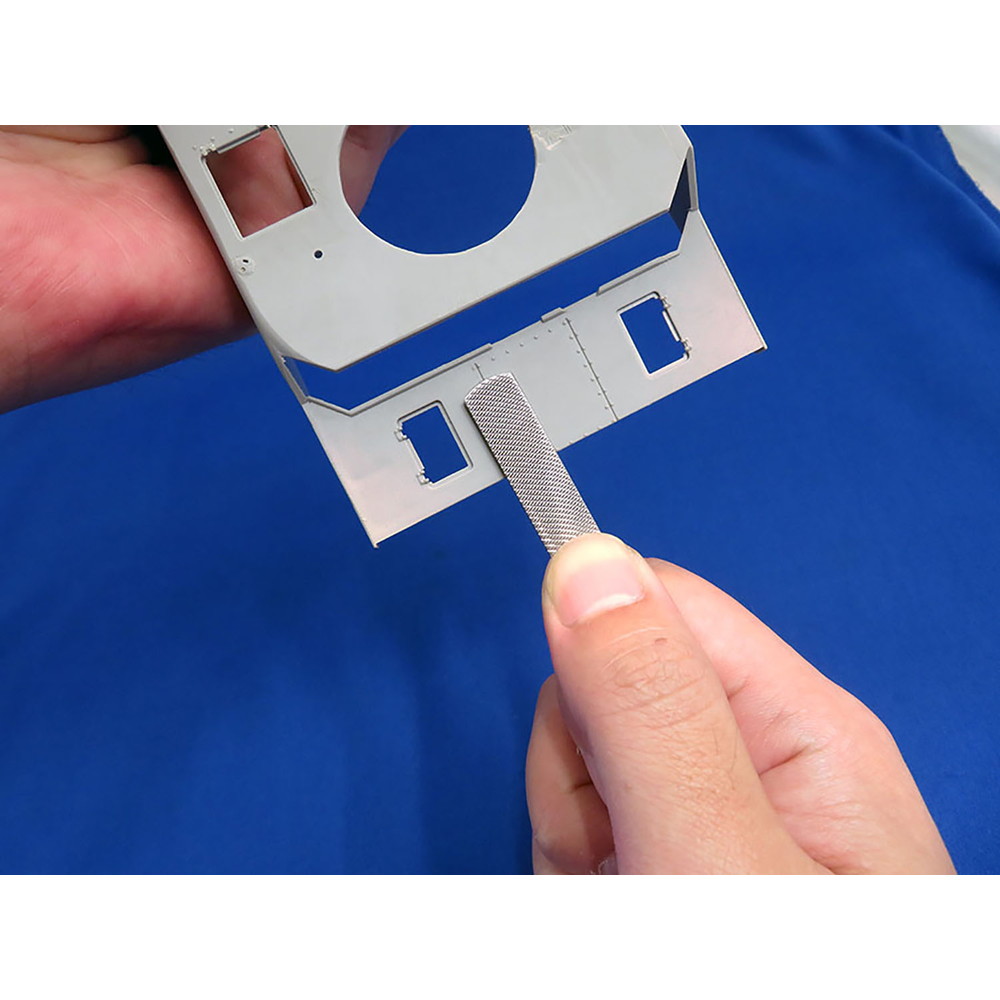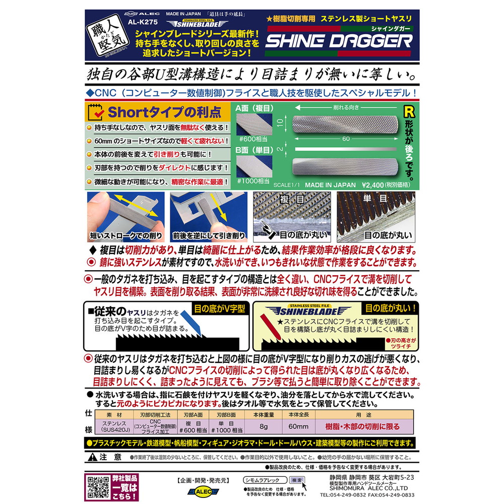 従来のヤスリはタガネを打ち込むと目の底がV字型になり削りカスの逃げが悪くなり、目詰まりしやすくなるがCNCフライスの切削によって得られた目は底が丸くなり広くなるため、目詰まりしにくく、詰まったように見えてもブラシ等で払うと簡単に取り除くことができます。