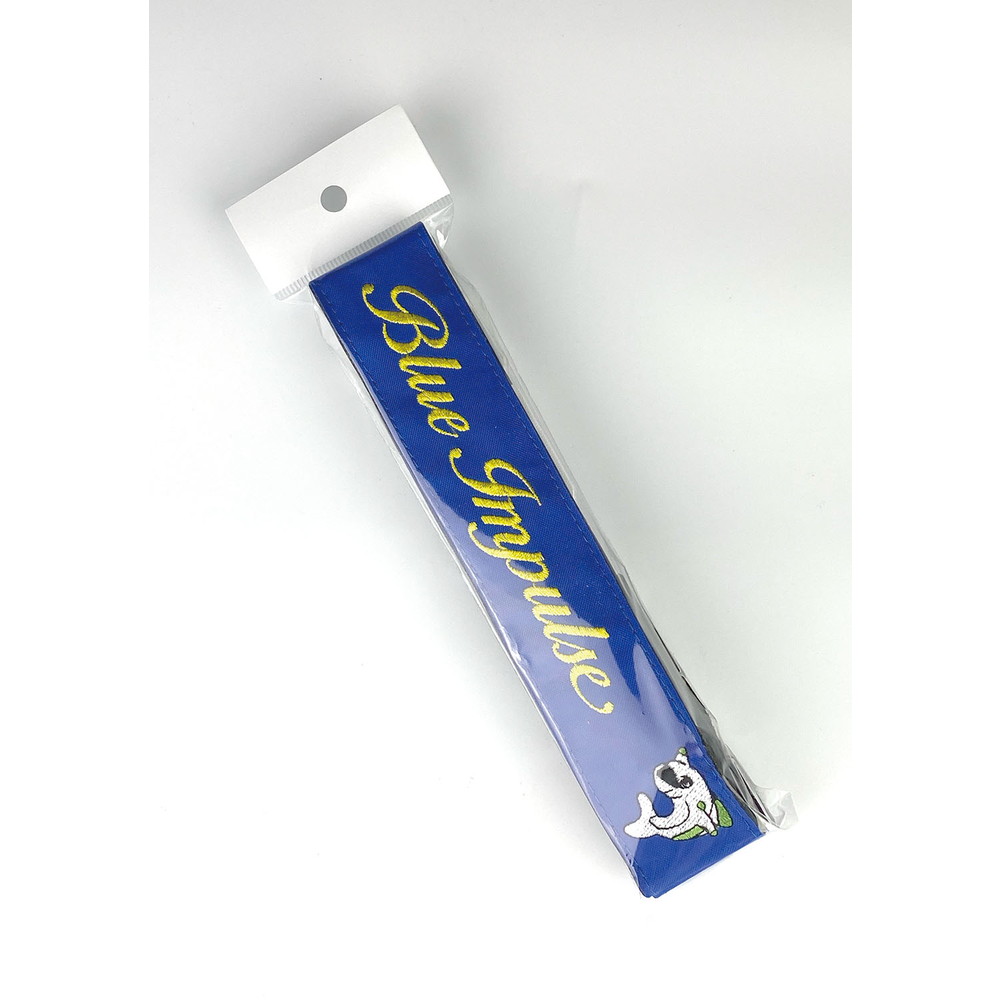 ブルーの地色にブルーインパルスのロゴマークが鮮やかなイエローで描かれたカメラストラップ。
